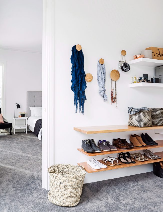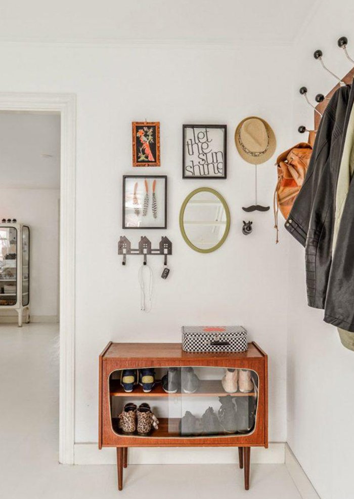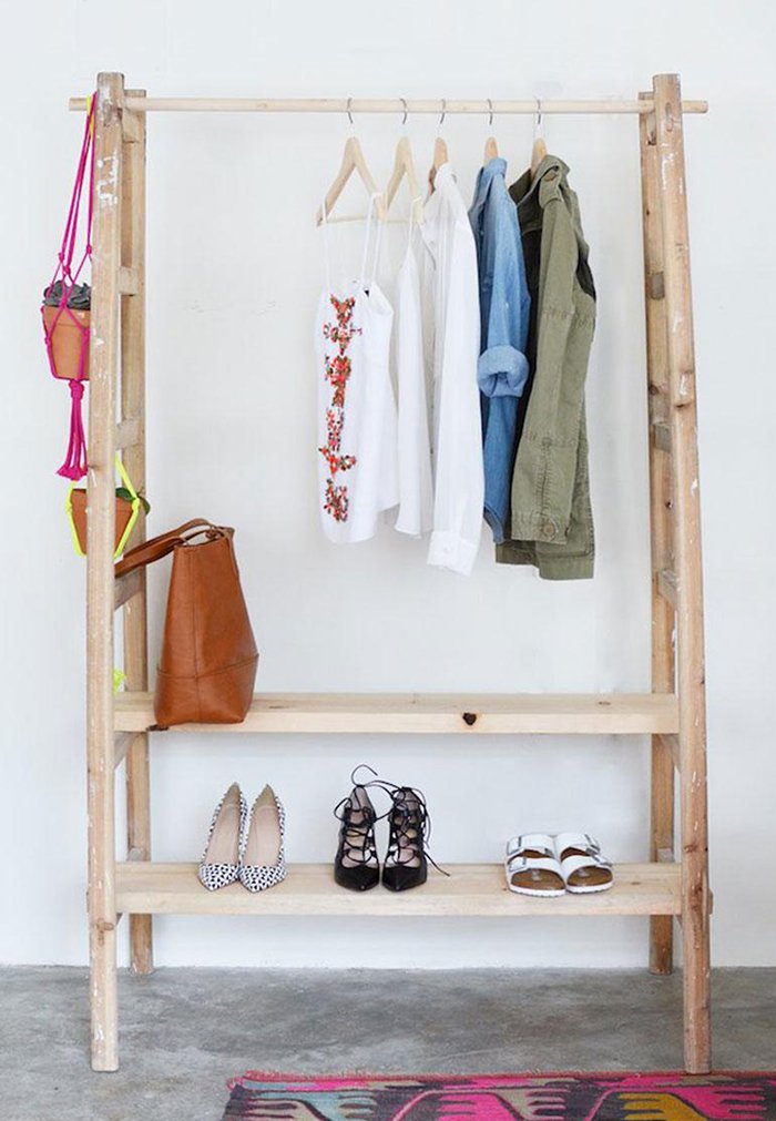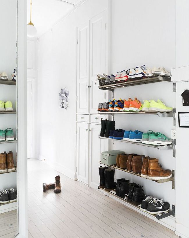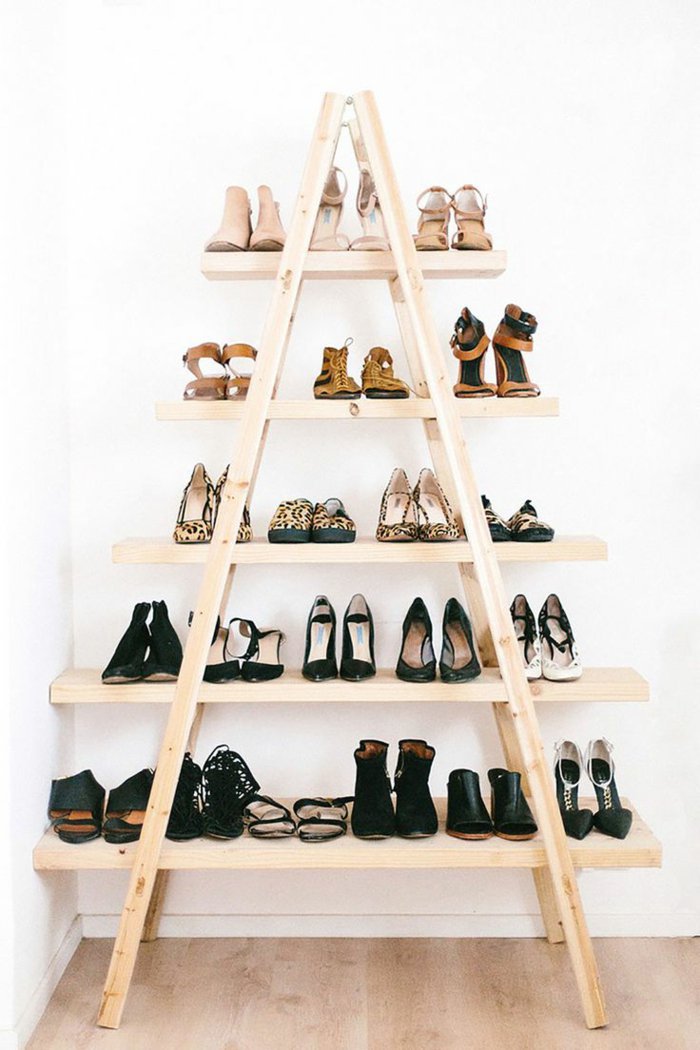 El zapatero incluso se puede hacer con una vieja escalera de tijera. Se fija en la posición de trabajo, después de lo cual se colocan tablas en los escalones, que sirven como estantes. Algunos artesanos van más allá y cortan la escalera de mano, luego la atornillan a la pared. Luego actúan de acuerdo con un algoritmo similar y arreglan las barras transversales en lugar de los estantes. Si una niña solitaria vive en el departamento y le encanta usar zapatos de tacón alto, entonces un sistema de almacenamiento lacónico montado en la pared que consiste en franjas de baguette se adaptará a ella. Se fijan en la superficie de la pared, colocando los "estantes" paralelos entre sí. Los zapatos se aferran a ellos como tacones. En lugar de trozos de baguette, puede usar una barra de cortina o toallero y dos ganchos.