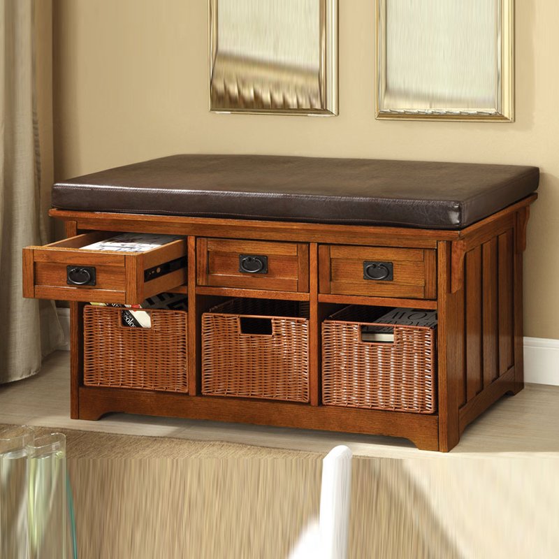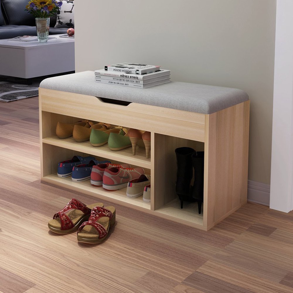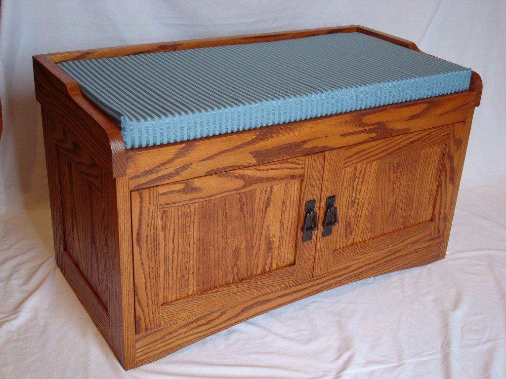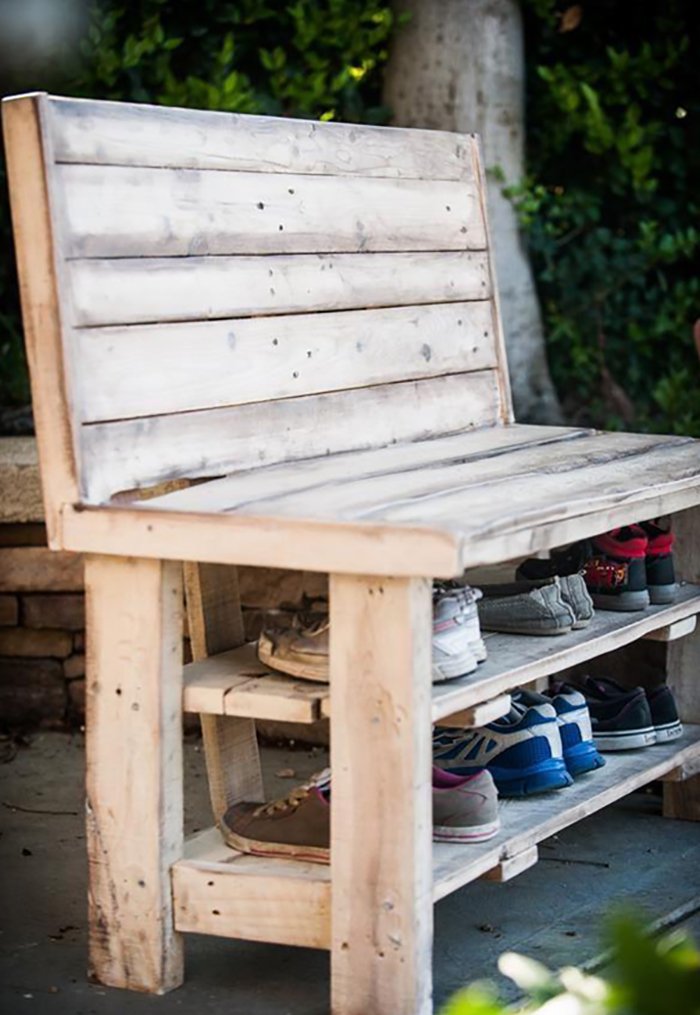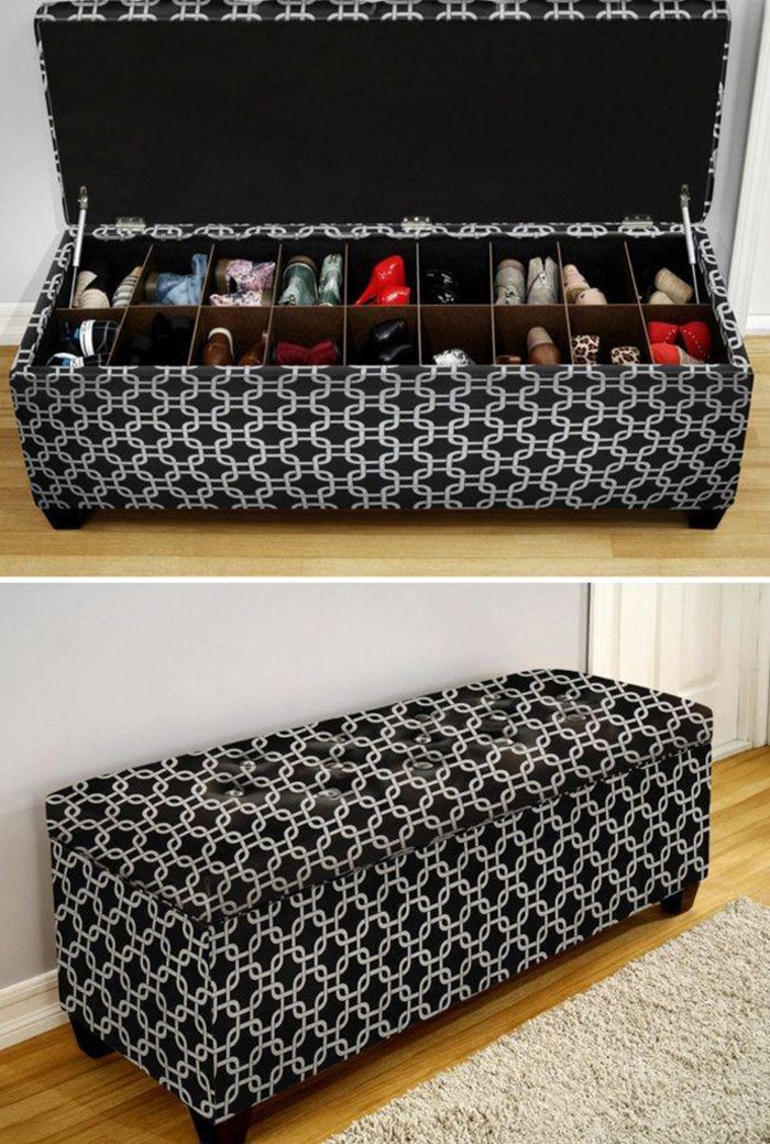 De hecho, este es un zapatero ordinario, que no está cubierto con una tapa ordinaria, sino con una mesa o asiento. Puede armar un estante a partir de una matriz de madera o aglomerado, a veces utilizando barras. Si el estante para zapatos se usará como banco para volver a calzar, entonces el diseño debe fortalecerse adicionalmente para aumentar el margen de seguridad. En lugar de armar un nuevo estante, puede usar un cofre viejo. Se lija, se cubre con una capa de barniz, pintura o se pega con papel. El sistema de almacenamiento está formado por láminas de madera contrachapada, formando una "celosía".Su ancho debe ser igual a la altura del cofre, ya que debe colocarse boca abajo. Los zapatos se colocan verticalmente en él. En la parte superior de la cubierta del cofre está cubierta con almohadas suaves o un asiento especial para facilitar su uso.
