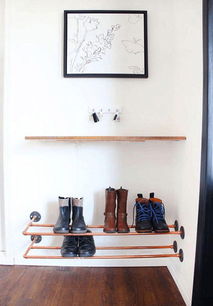 Para hacer un estante de metal simple, no necesita perforar la fragua en absoluto. En interiores modernos, los estantes lacónicos hechos de tubos delgados son muy populares. Se cortan módulos de diferentes longitudes, que luego se sujetan con accesorios (tes, esquinas). Los bordes están obstruidos con tapones, y la estructura misma está fijada a la pared. Las tuberías deben estar recubiertas con un compuesto anticorrosivo especial que protegerá el material de los efectos nocivos de la humedad. Puede usar una pintura especial con el efecto de bronce, plata u oro. Este estante es ideal para interiores en los estilos steampunk, retro y loft. Para el minimalismo, se utiliza un diseño aún más simple en forma de marco "desnudo".En sus barras transversales se fijan ganchos, en los que posteriormente se colgarán los zapatos.