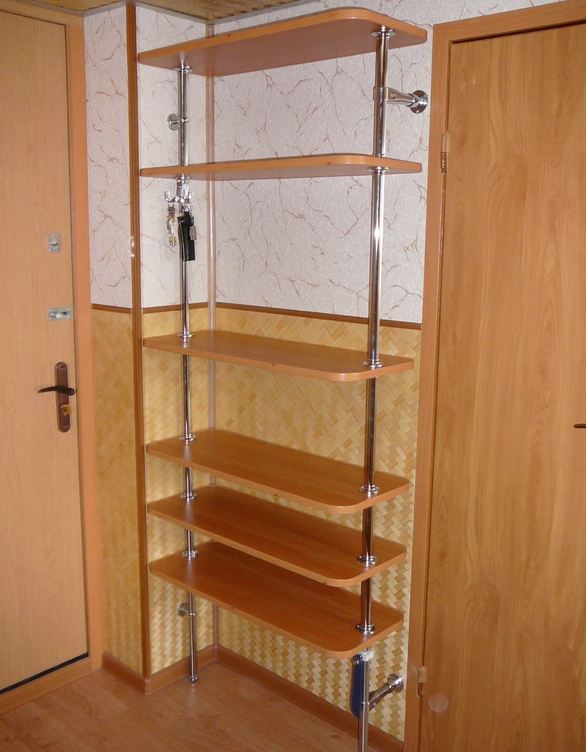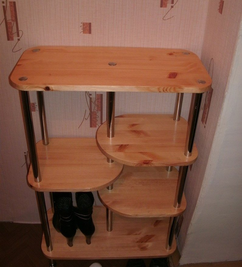 Desde el laminado, puede hacer rápidamente un estante simple. Para el trabajo solo necesitará el material principal y los tubos de metal. El número de láminas laminadas depende del tamaño del futuro estante para zapatos.En tubos de metal con un molinillo haga ranuras. Luego se insertan estantes en ellos. Los tapones se fijan en los extremos de los tubos para proteger los agujeros de la suciedad y el polvo.