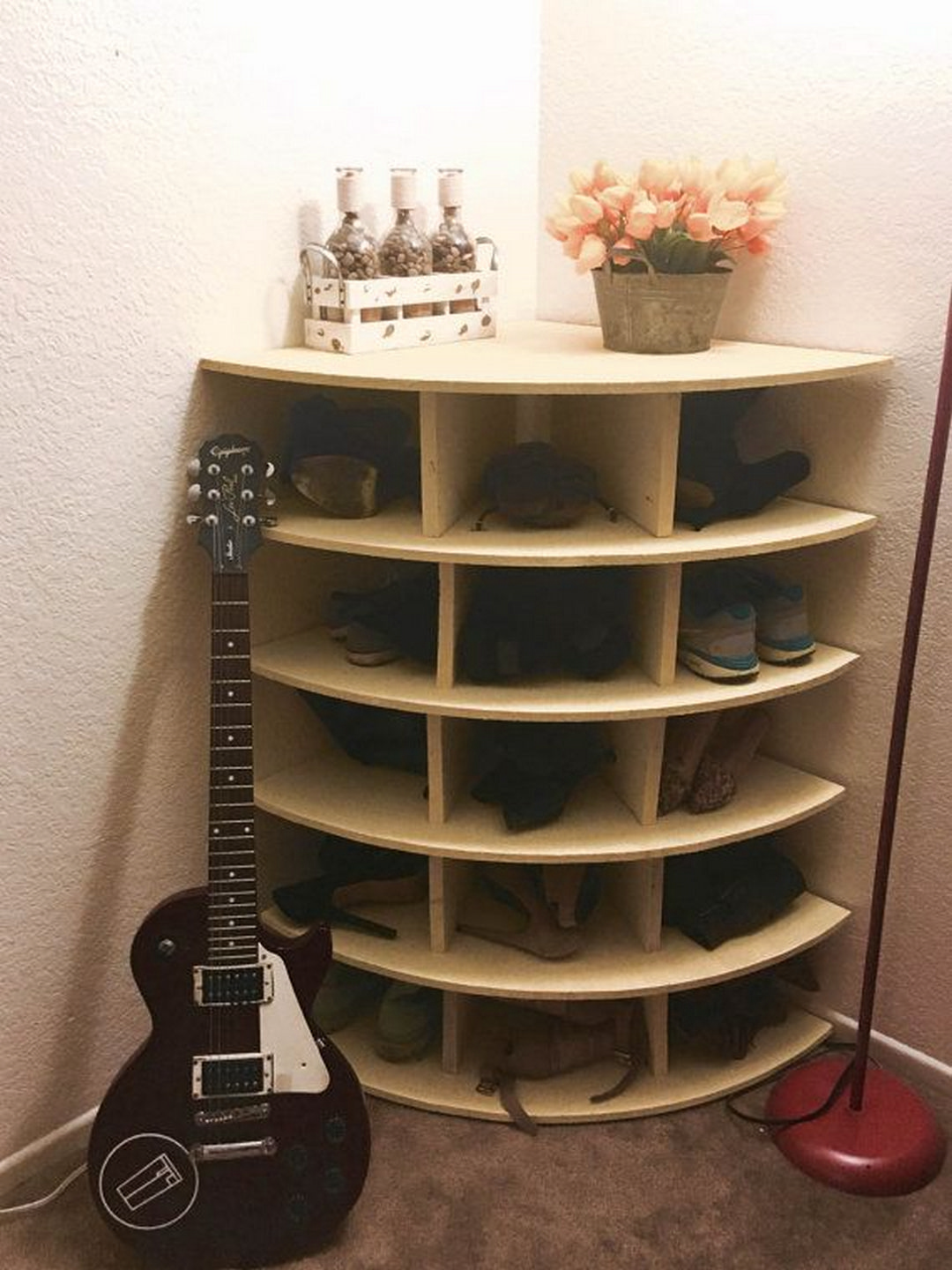No es tan difícil hacer un estante de zapatos giratorio redondo como podría parecer a primera vista. Para trabajar, necesita láminas de aglomerado o madera contrachapada para elegir el maestro. Es necesario hacer varios espacios en blanco: