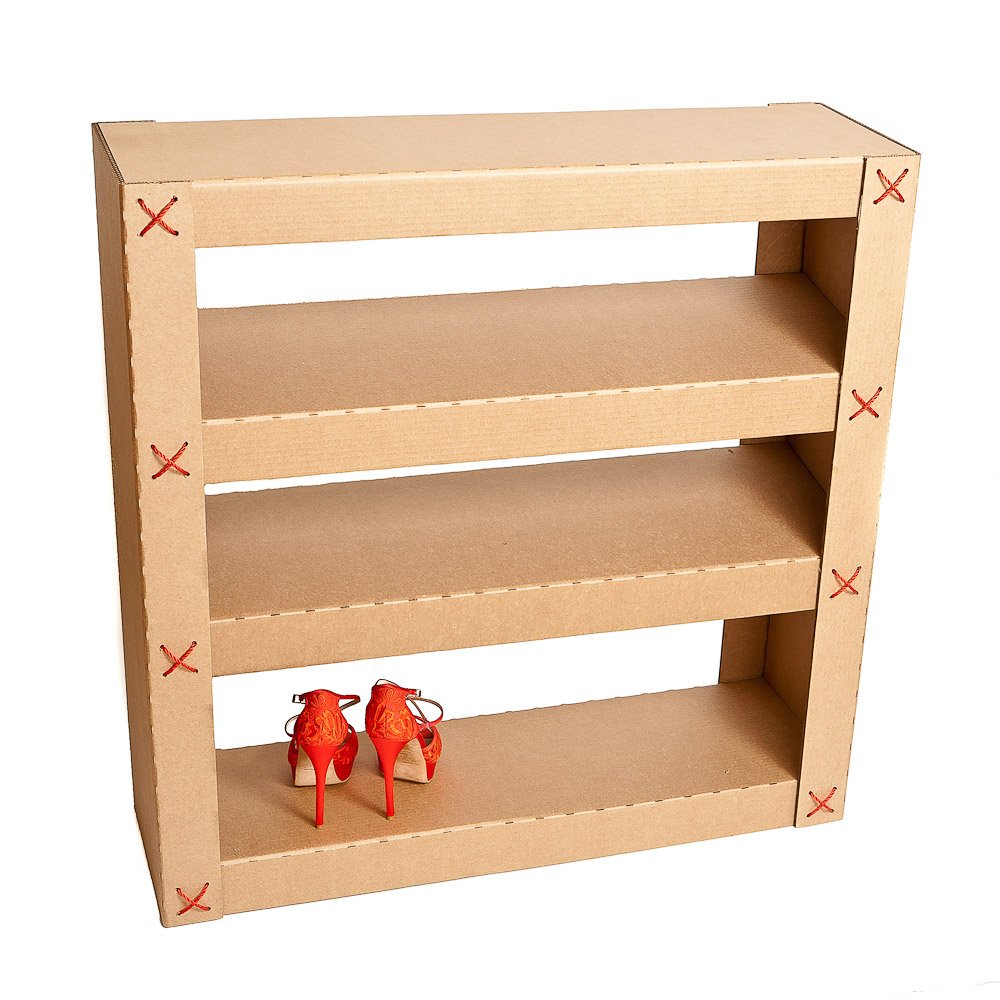 Esto puede parecer sorprendente, pero los muebles gruesos y resistentes al desgaste pueden estar hechos de cartón grueso. El único inconveniente de este material es la falta de protección contra la humedad, que no puede ser compensada por algo. Se ensambla una estructura de varios módulos, que se cortan de las cajas. Cada parte se hace por separado. Se corta una pieza de la caja junto con la parte inferior. La altura del módulo será igual a la profundidad del estante futuro, ya que se ubicará horizontalmente (es decir, la parte inferior "mirará" a la pared). Cada parte está pegada con una segunda capa de cartón para darle mayor resistencia. Una vez que todos los módulos están listos, se interconectan, colocando uno encima del otro. Resulta una cosa compacta. Dado que la superficie de cartón tiene una apariencia bastante simple, se pega con papel.