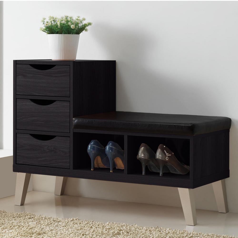 Banquetes combinados con estanterías. La parte inferior del elemento del mueble está reservada para guardar zapatos, y la superior está diseñada como asiento. Tales bancos son opciones compactas para pasillos estrechos.