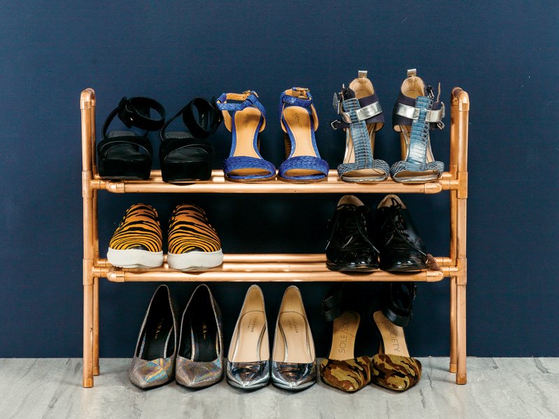 El diseño tendrá la forma de un panal. Tal estante se ensambla de acuerdo con el principio del diseñador: es conveniente agregarle nuevos módulos y es fácil dar la configuración más extraña. Las tuberías se cortan en piezas de la misma longitud para que quepan los zapatos. Luego, estos modelos se interconectan pegándolos juntos.La estructura terminada se puede recubrir con pintura o pegar con cualquier material a mano. Ni siquiera los zapatos muy limpios se pueden poner en un estante de PVC, ya que el material, a diferencia de la madera y el metal, no teme a la humedad.