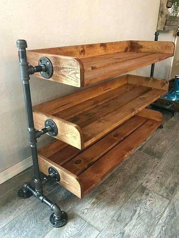 Después de que la composición se haya secado, el estante terminado puede colocarse en el pasillo o corredor y colocar zapatos sobre él. En lugar de las paredes laterales clásicas de los tableros, puede usar barras, ladrillos o incluso botellas de vidrio. Para la última opción en los estantes, deberá cortar las aberturas para los cuellos, en los que se "desgastarán". La opción con el uso de ladrillos es adecuada para los más perezosos. Tal composición no es adecuada para todos los estilos. Se verá mejor en un interior industrial. Primero, los "ladrillos" están formados por ladrillos apilados en dos o tres filas. Después de eso, arreglan el primer estante. Luego viene la segunda fila lateral de ladrillos y nuevamente la barra horizontal. El número de pisos de dicho estante es ilimitado. Con el tiempo, incluso puede agregar nuevos estantes al diseño.