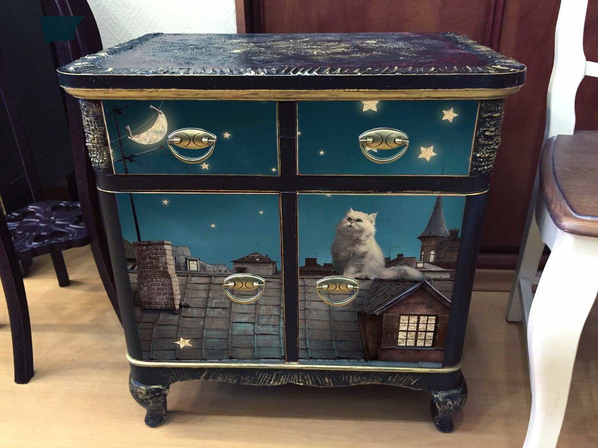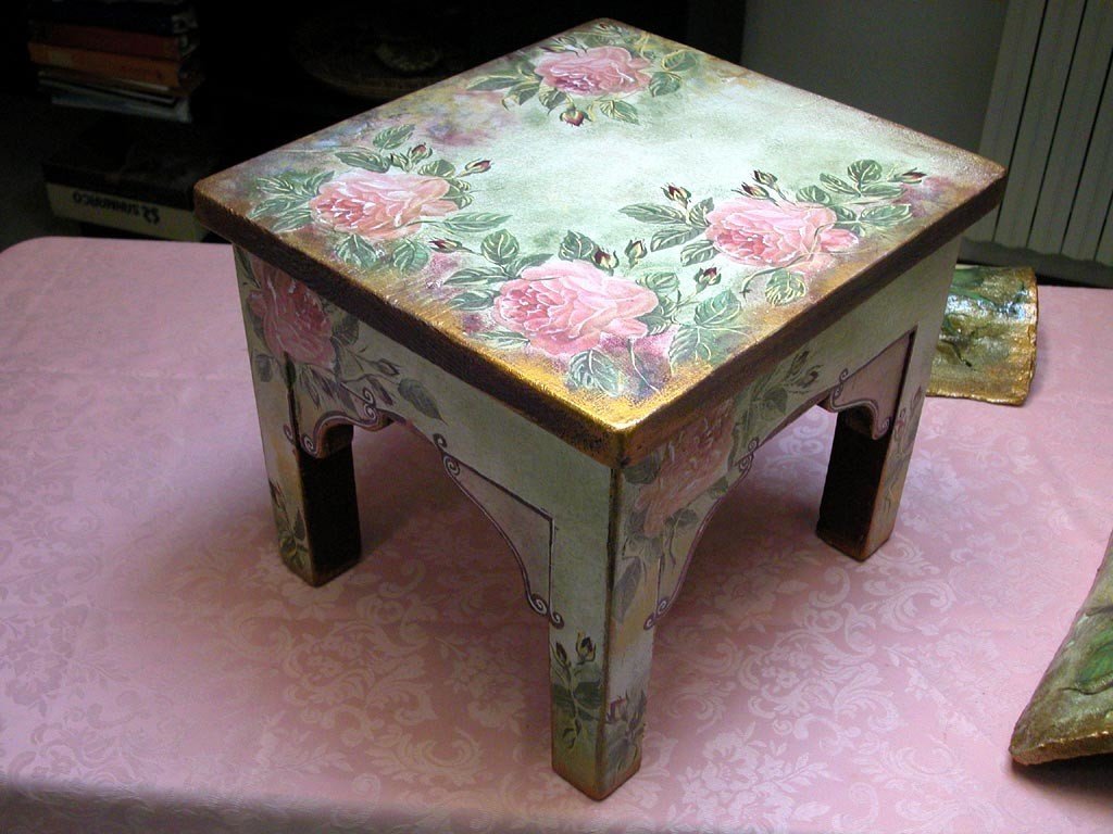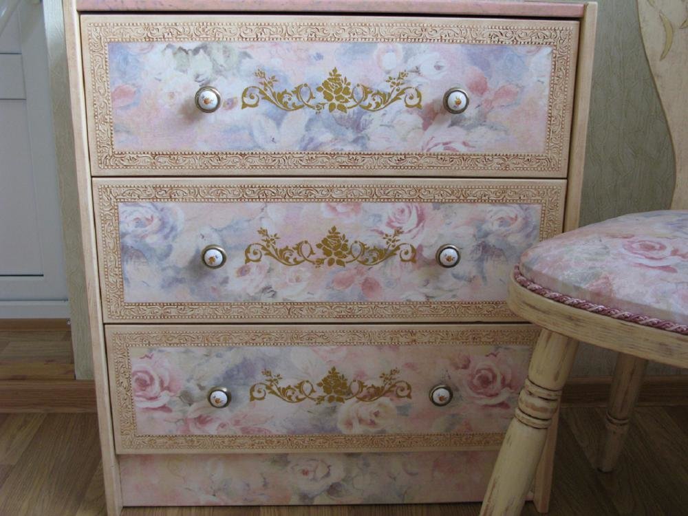 Un método muy simple e interesante de restauración de muebles, que será interesante incluso para niños. Dibujos hechos de tela y papel, adornos pegados a productos, barnizados. Hay varias variedades de decoupage: