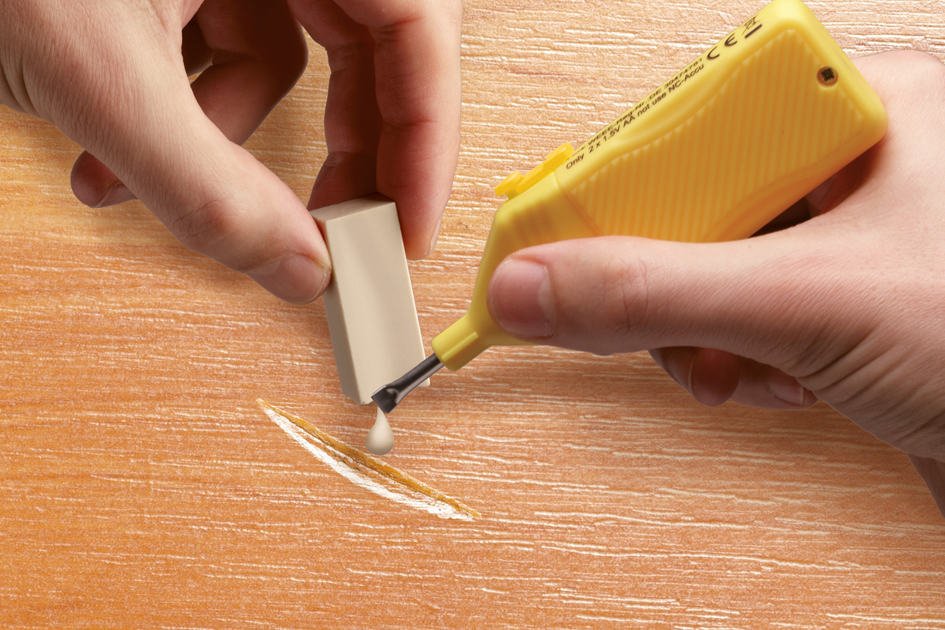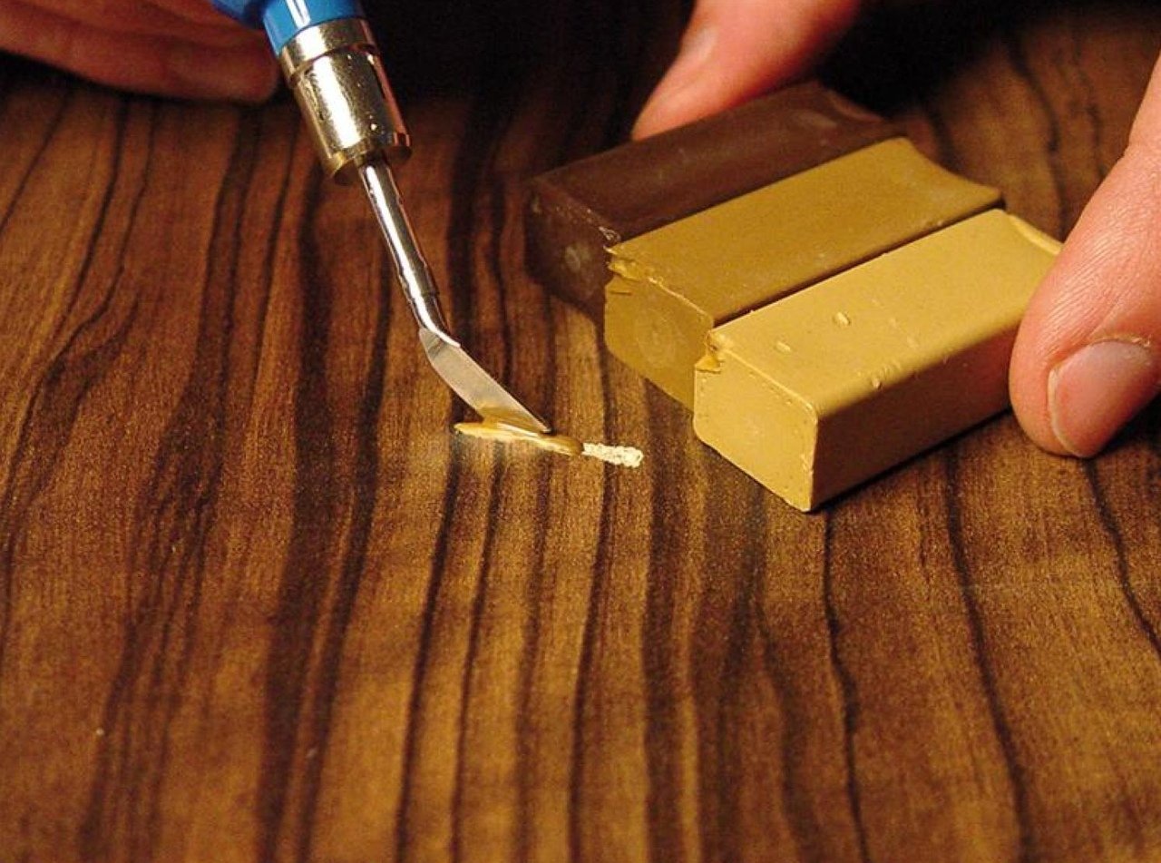 Muebles de cera dura. La sustancia derretida con un soldador, se aplica un encendedor al lugar dañado con exceso. Después de nivelar, pulir, barnizar la superficie.