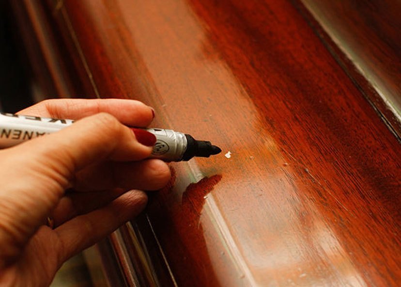 De madera. Limpie el polvo solo con un paño seco. Puede restaurar el brillo con aceite de limón. Los rasguños pequeños se limpian con un crayón de cera coloreado o un lápiz especial;