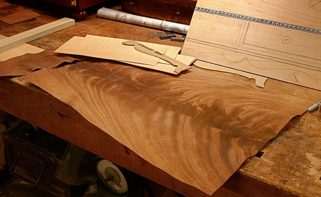 Preparación de chapa. El rollo se desenrolla, el material se humedece con una esponja humedecida, cubierta con un paño o papel de regalo, colocada entre dos láminas planas de madera contrachapada, tablero de fibra. Después del secado, se vuelve recto.
