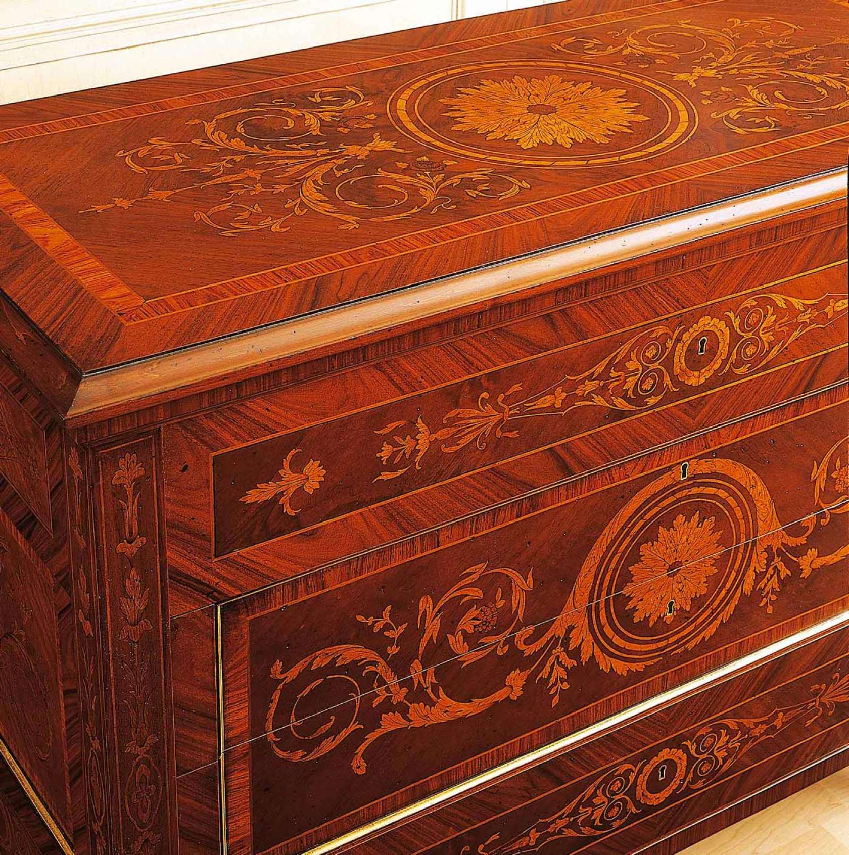 Una de las técnicas de decoración de muebles más antiguas conocidas desde el antiguo Egipto. Dibujar una imagen figurada de un árbol en un árbol se llama intarsia. En casa, realizar este tipo de mosaico es bastante difícil. Las placas de madera que componen la imagen general encajan perfectamente y se pegan.La parte delantera es lisa, barnizada, pulida.