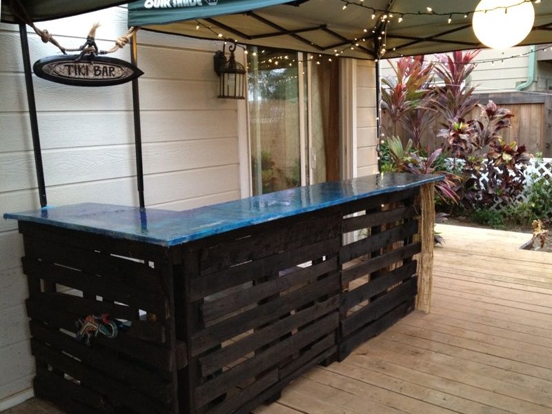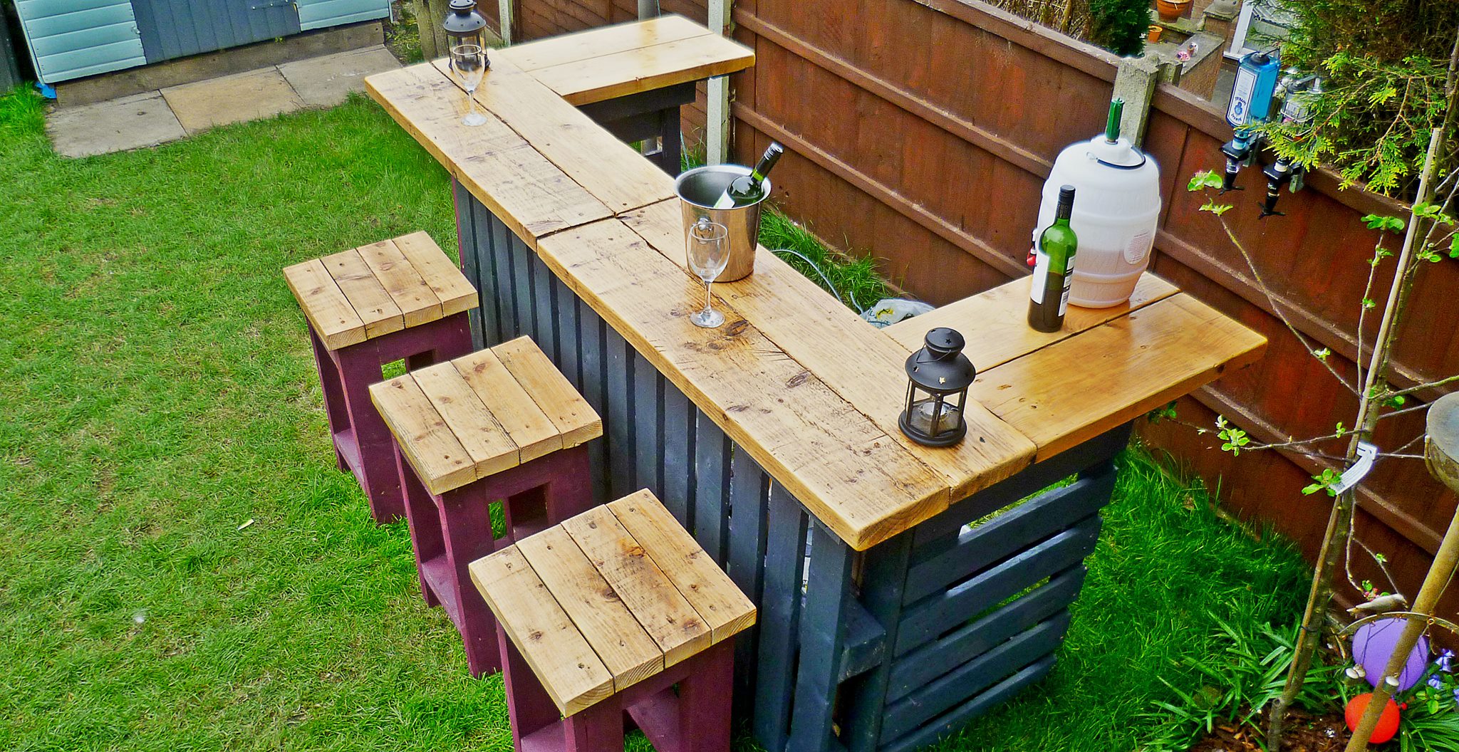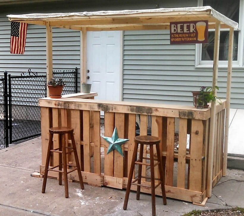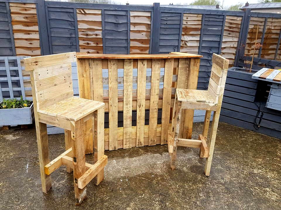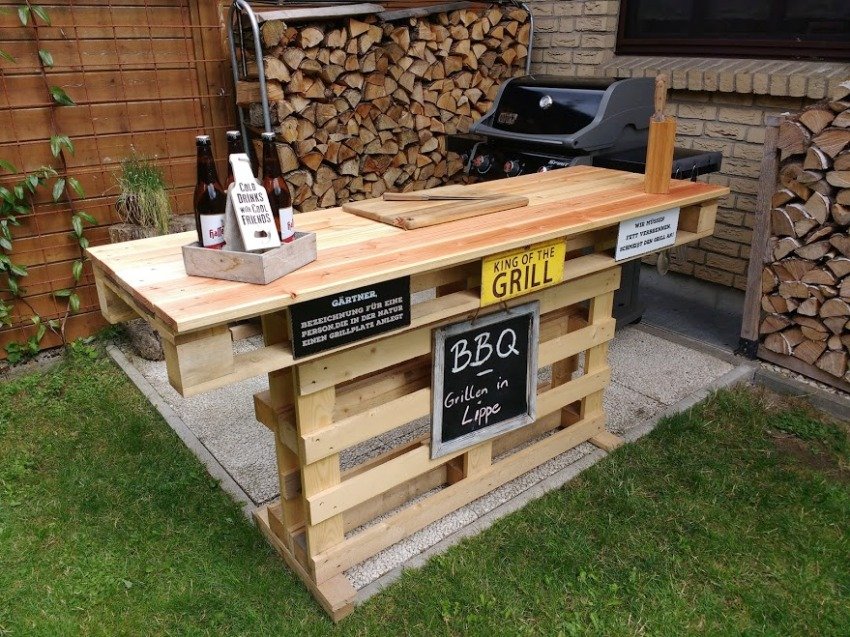Preferir mucho tiempo al aire libre es un bar para el jardín. El consumo de material dependerá directamente de la escala del diseño. La base lateral del mostrador en forma de C está hecha de al menos cuatro paletas conectadas colocadas verticalmente. La construcción lineal se recoge de 2-3 o más. La base en sí está construida con aproximadamente el mismo número de paletas. Se hace con un receso, mientras que el suelo se fortalece con grava. La encimera se ensambla con elementos anchos y gruesos, no con paletas. Las tablas se clavan en el nivel superior desde paletas o cajones verticales de la base lateral. Es necesario seleccionar la altura del mostrador de la barra teniendo en cuenta la longitud estándar del palet: 1,2 m. Para la comodidad del trabajo y la ergonomía del producto, se ajusta perfectamente. Para el estante necesitarás sillas. Es mejor recogerlos no de paletas, sino de tableros de residuos para encimeras. Por esta razón, al fabricar este último, debe pensar en los puntos para cortar por adelantado.