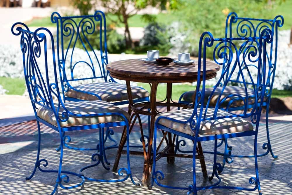 Una larga vida útil combinada con las cualidades anticorrosivas de los productos modernos es lo que hace que el material sea adecuado para el ensamblaje manual y, en consecuencia, un ahorro adicional. Las mesas y sillas de metal encajan perfectamente en el fondo verde de arbustos y árboles.Los productos propios son mejores para ensamblar a partir de aluminio; no es en vano considerado el mejor. Los asientos a menudo están hechos de plástico o madera, pero la calidad del aluminio también es adecuada para crear un asiento cómodo. Las piernas se pueden hacer con tubos de calefacción. Para sujetadores necesitará soldadura o pernos. Las tuberías se doblan con un disco de automóvil. Para evitar que la pieza de trabajo se agriete, se vierte arena en la cavidad y se sella con pequeñas barras. Para encimeras, una hoja QSB y tableros impregnados son adecuados. Los asientos a menudo están hechos de goma espuma, enfundados con cuero de vinilo o dermantina.