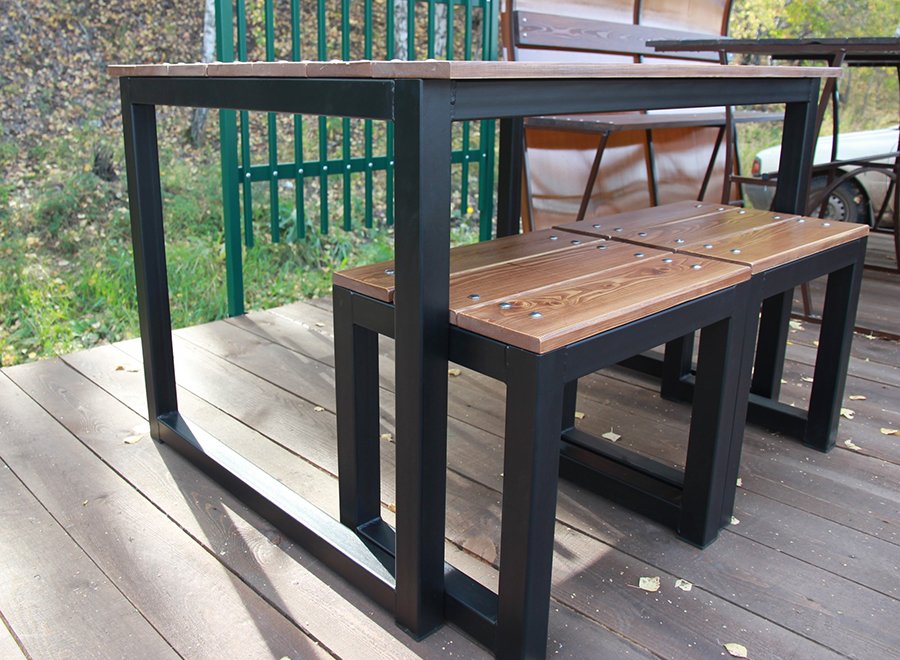 En la vida cotidiana, a menudo se encuentra una combinación de una mesa de madera y patas de metal. Cambiar algo en esta combinación no tiene sentido. En el caso de las tiendas, a veces actúan de manera diferente. En las opciones de diseño con abundantes formas tecnológicas, el metal es a menudo "superior". El grosor del asiento se minimiza para que no se caliente demasiado al sol. Los muebles que son interesantes en términos de geometría no están de más para decorar. Por ejemplo, iluminación interna. Se encuentran excelentes combinaciones de madera y metal en la construcción de cenadores, áreas de recreación, terrazas. Las combinaciones se pueden diluir con piedra, vidrio, plástico, epoxi. Una mesa con una malla metálica en el papel de un soporte debajo de la encimera no hace daño al llenarla con piedras. En el jardín, debe asignar una zona para almacenar accesorios como estanterías, y es mejor hacerlo de la misma manera con el uso de metal y madera.