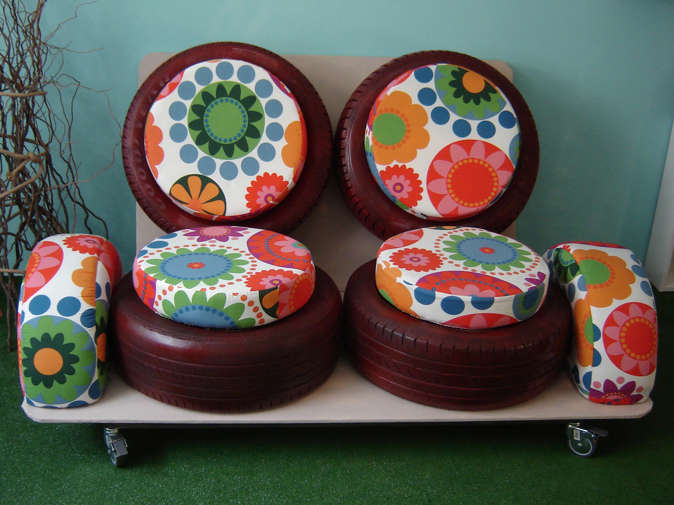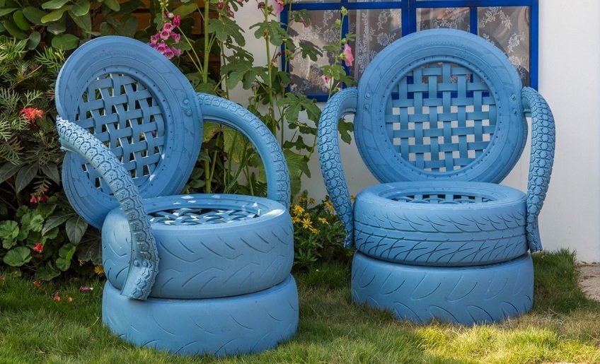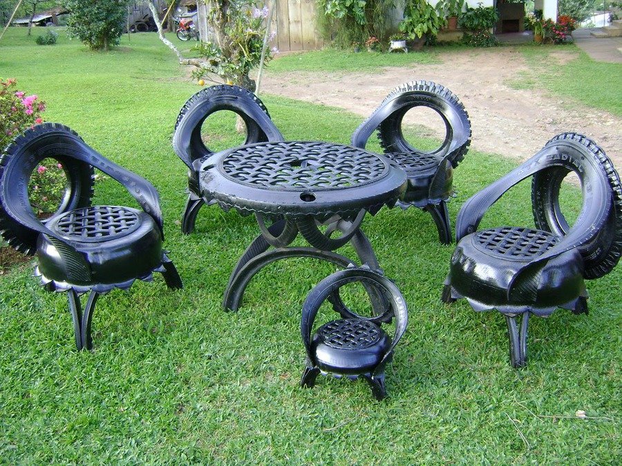 Muebles de jardín hechos de neumáticos de varias maneras. En una realización, los neumáticos se combinan sin cambiar de forma. El segundo enfoque consiste en obtener tiras de espacios en blanco. Bueno, el último método es cortar los neumáticos en diferentes partes. Una mesa ordinaria se ensambla a partir de solo 2 neumáticos superpuestos y tableros de mesa de madera o vidrio.Una llanta con un disco es suficiente para hacer un swing. Si ensamblas una partición con perchas y cadenas, entonces los neumáticos en ellas cumplirán el papel de macetas. Los asientos originales están hechos de neumáticos. Una técnica implica el uso de un anillo cortado para formar la espalda y los reposabrazos. En este caso, las patas de soporte y la parte posterior de la espalda están formadas por medios anillos rígidos. Las piernas se colocan sobre soportes metálicos. El asiento está hecho de una tabla redonda de madera o un plexo de aletas de goma.