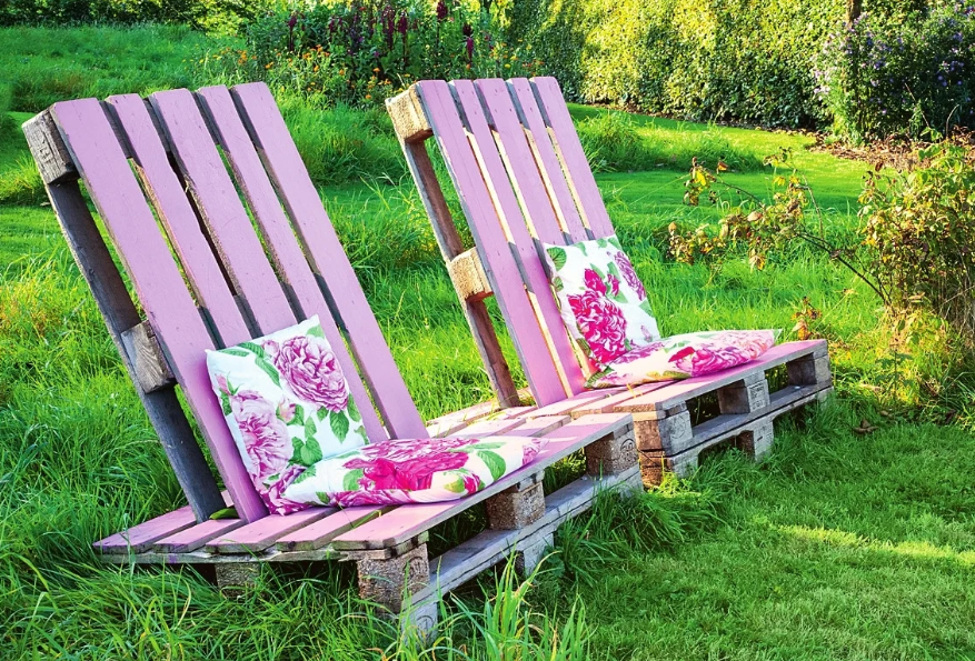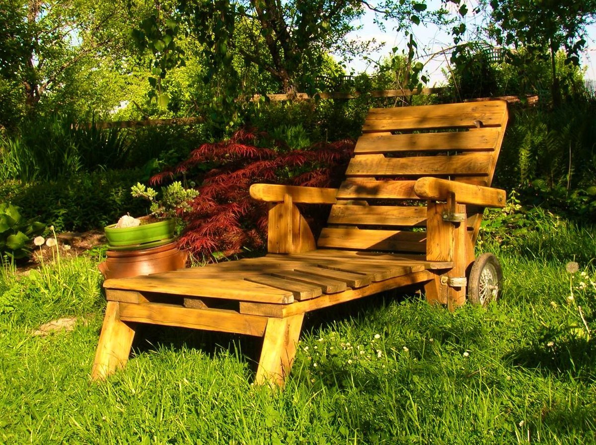 Primero, visualmente forme la parte posterior de la cama solar. Colocamos una paleta desde arriba en ángulo y luego retiramos varias tablas del lienzo superior.El ancho de la paleta inferior se reduce a un valor igual al doble grosor de la cara final. Tenemos en cuenta que los extremos laterales opuestos de la estructura superior no siempre tienen el mismo grosor. Retiramos con cuidado las tablas de paletas superiores para desmontarlas, ya que pueden ser útiles para modificar el diseño de la tumbona terminada. A continuación, colocamos la parte posterior de las piernas y conectamos el asiento y el respaldo con algunas fijaciones más. Elegimos sujetadores móviles, para ajustar la parte posterior, pero la tumbona incómoda habitual se ve bien. El producto terminado deberá procesarse y pintarse cuidadosamente. Alternativamente, puede hacer otro dibujo de la parte posterior y formar la base para ello en la continuación del nivel inferior.