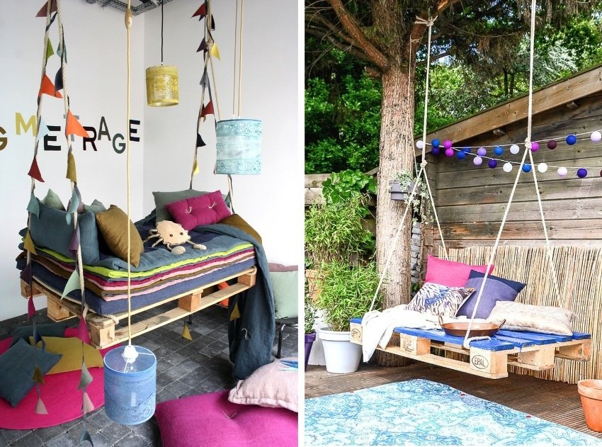 La estructura de la plataforma es ideal en términos de montaje de estructuras rectangulares. La pintura ocultará el deterioro del material y enfatizará su forma. Los productos de tamaño mediano son móviles, y la mayor cantidad de sujetadores les proporciona una vida adecuada. Los sillones y las mesas se transfieren a un lugar conveniente en el sitio a la primera necesidad. Las paletas no deben usarse sin limpieza previa. También se muelen y procesan con diversas composiciones. Las paletas se recogen en escritorios, puestos de flores, casas de mascotas. El sitio está equipado para cualquier necesidad. A veces, los conjuntos completos se ensamblan a partir de paletas, comenzando por otomanas, mesas de café y terminando con bancos y sofás largos. Solo necesita tiempo, material y ganas, y de las viejas cajas se recogerá una carrera de obstáculos o un área de juego interesante.