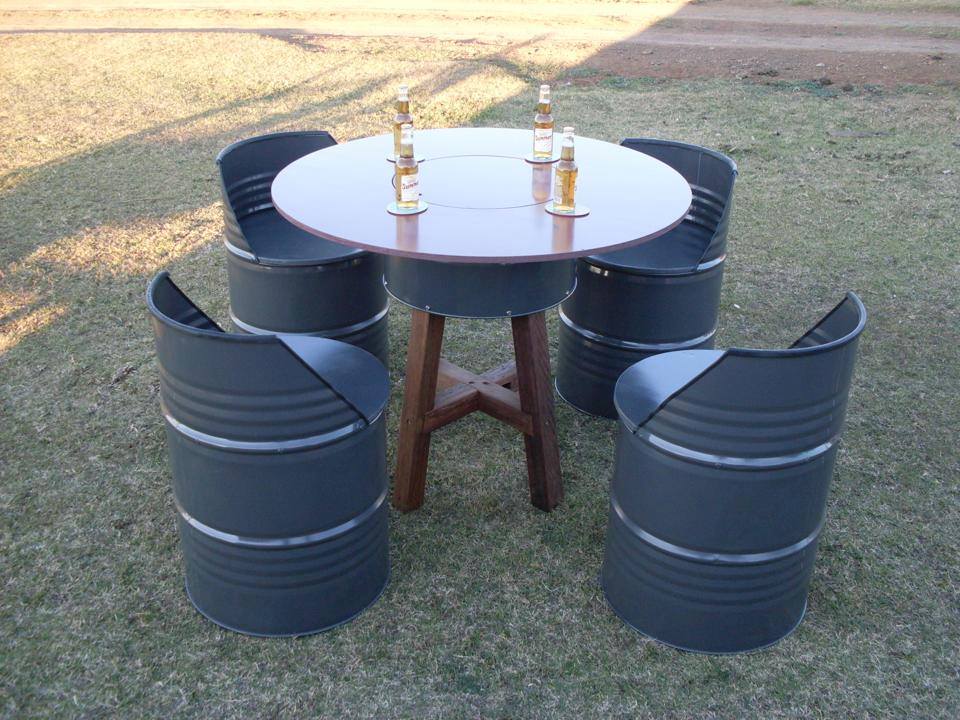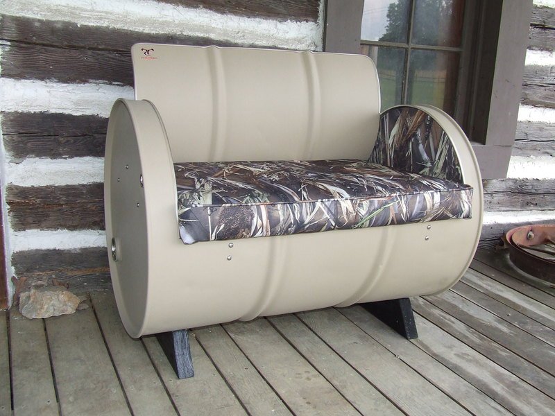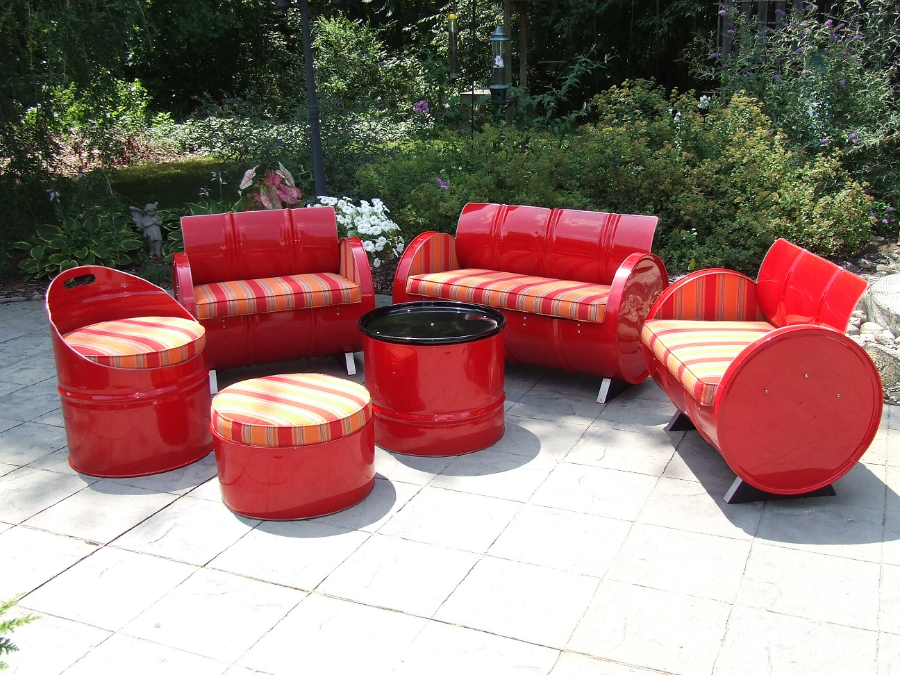 Los lavabos se instalan en el jardín o en el césped. A veces, el material es un barril de metal, y la opción se ve mejor con un color oscuro y una textura mate. Por el mismo principio, se fabrican mesas con encimeras compactas y sillas con los mismos asientos pequeños."Cherry on the cake" será barriles de metal multicolores con aberturas recortadas para asientos y respaldos de los fragmentos resultantes. Además, los productos encajarán perfectamente en un entorno cerrado. Los barriles de madera se usan mucho más a menudo. Los detalles para muebles grandes y pequeños se cortan de ellos. Barriles de vino se convierten en parte de sillas, sofás, mesas. Las macetas para plantas grandes, un refrigerador portátil o un tanque de hielo también son excelentes opciones para los meses más cálidos. Incluso un dispositivo tan poco común como un bote de basura también a veces está hecho de un barril de madera.
