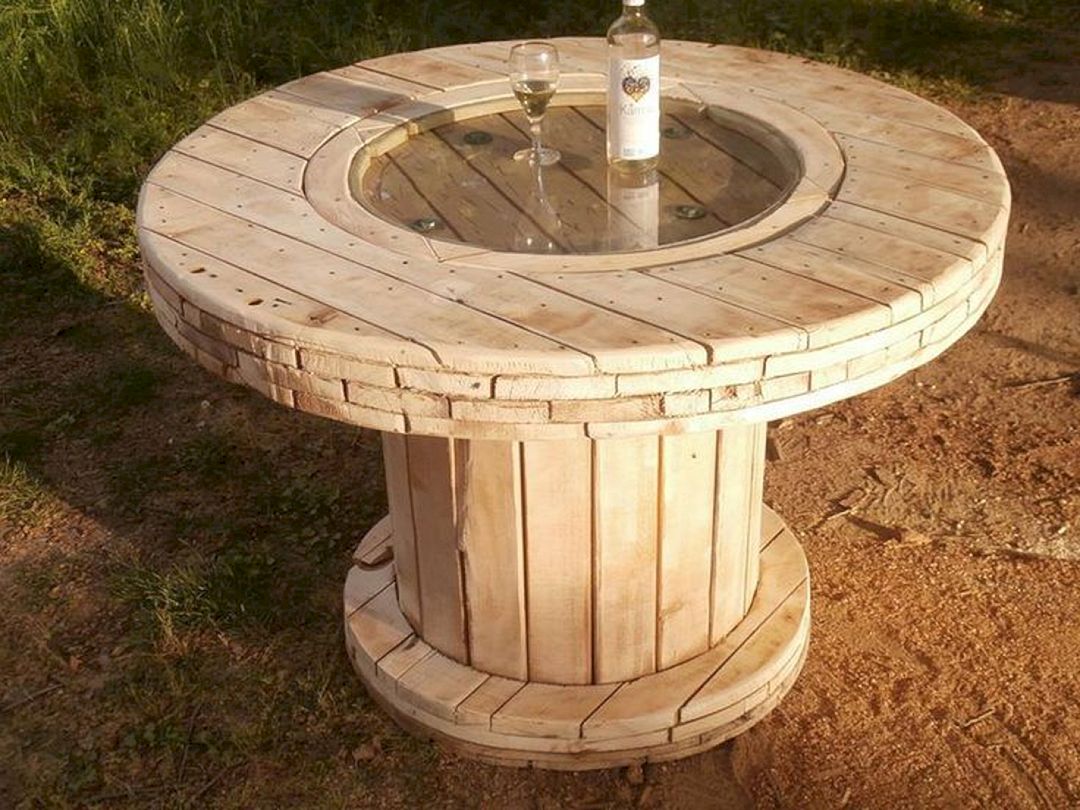 Las bobinas de alambre encuentran un lugar en interesantes objetos de diseño. De las tablas redondeadas recogen sillas originales con lados redondos, que se asemejan a una mecedora. Las bobinas a veces se recortan para darle a la forma un aspecto personalizado. Los soportes y las mesas pequeñas a veces se unen a los tableros. La forma de los carretes "insinúa" la posibilidad de usarlo como mesa y al mismo tiempo como base de la mesa. Un conjunto de muebles de jardín se puede ensamblar completamente a partir de bobinas y con un número mínimo de piezas cortadas. No habrá tantas opciones para la decoración, pero cualquier producto de metal que esté montado sobre una superficie de madera se convertirá en decoración. Se gastará un mínimo de esfuerzo en el montaje del puf. Solo necesita moler, pulir y colorear el tambor, luego cortar la tela y preparar el relleno. Los muebles se preparan con la ayuda de grapadoras de muebles.