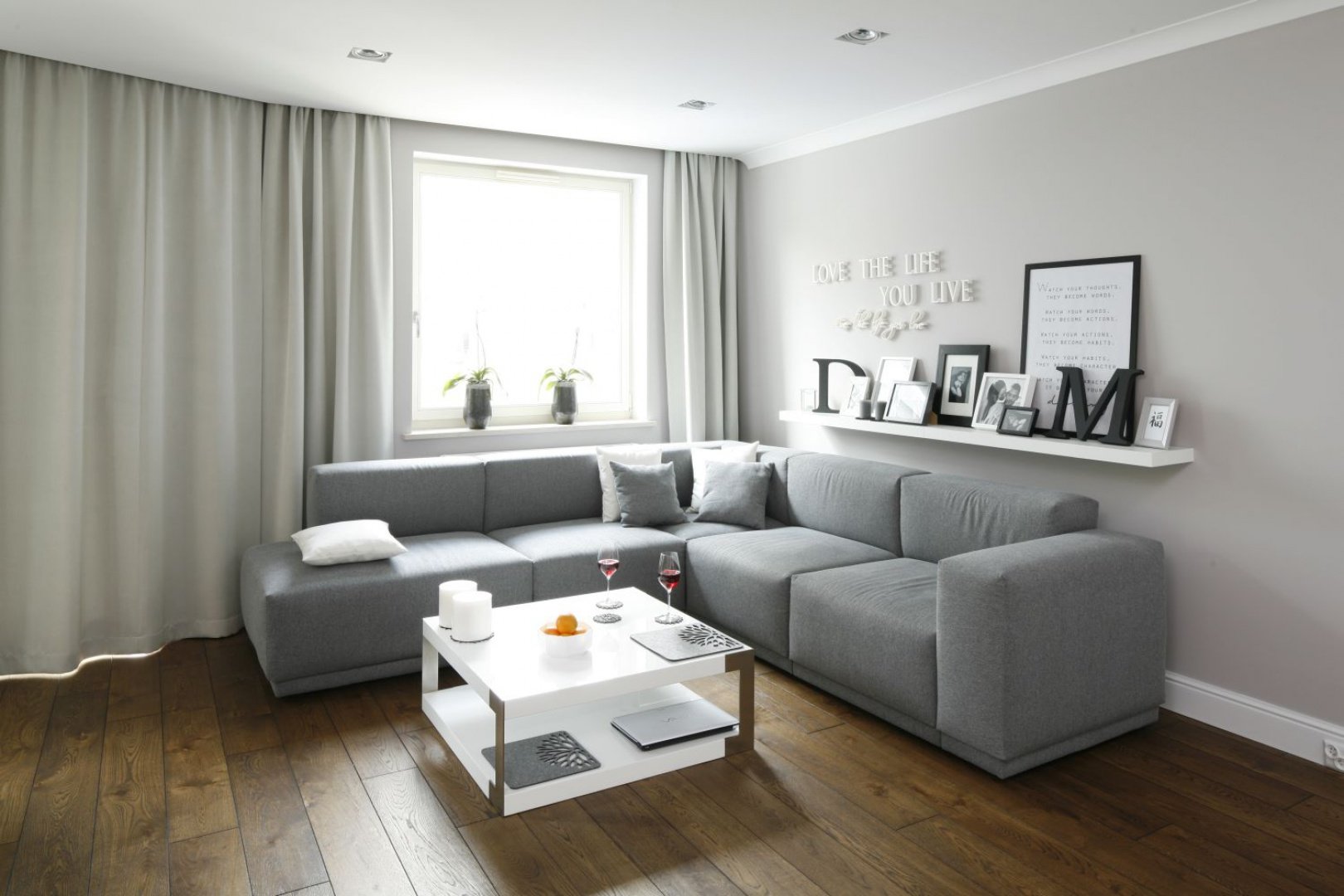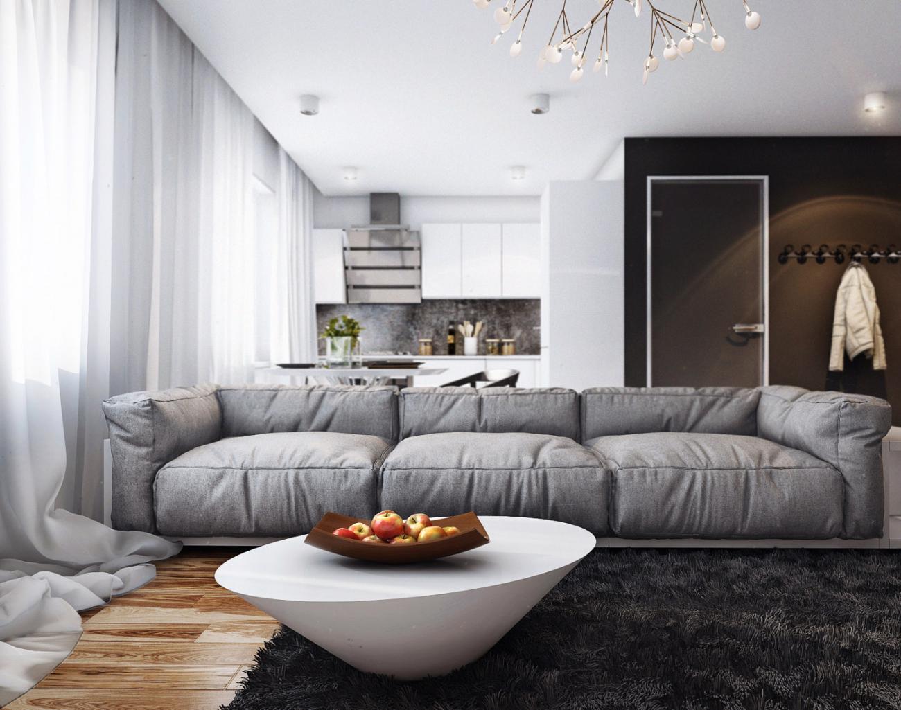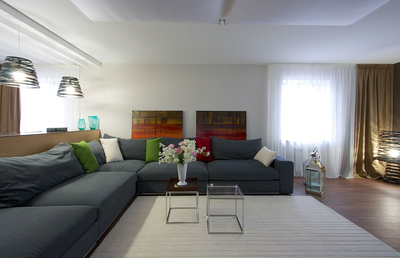 Dotado de la función de un acento de un solo color, un enorme sofá gris que llama la atención tan pronto como abre la puerta es oscuro y poco interesante.Coloréalo con almohadas, decora la habitación con cortinas o una alfombra con un estampado adecuado: el interior brillará con colores brillantes.