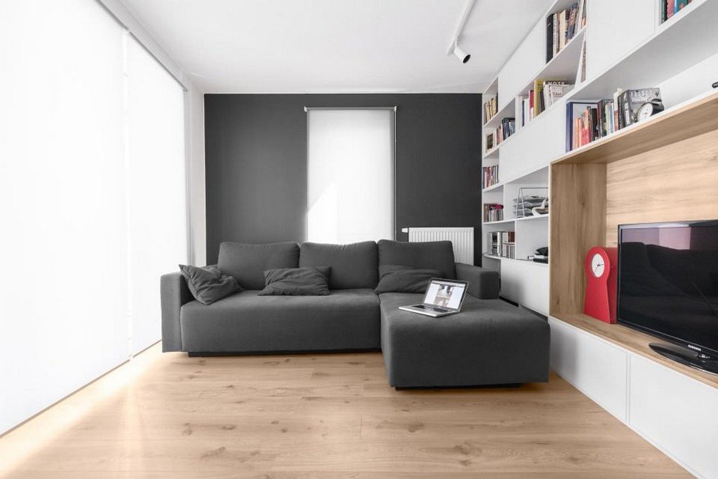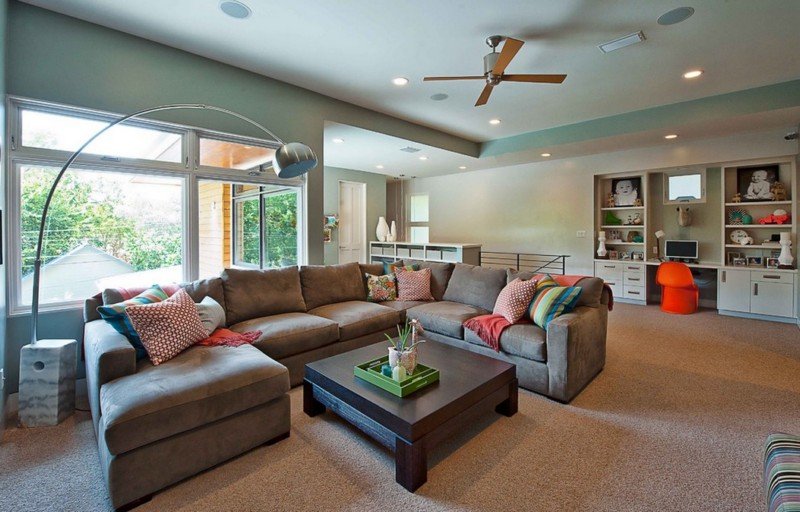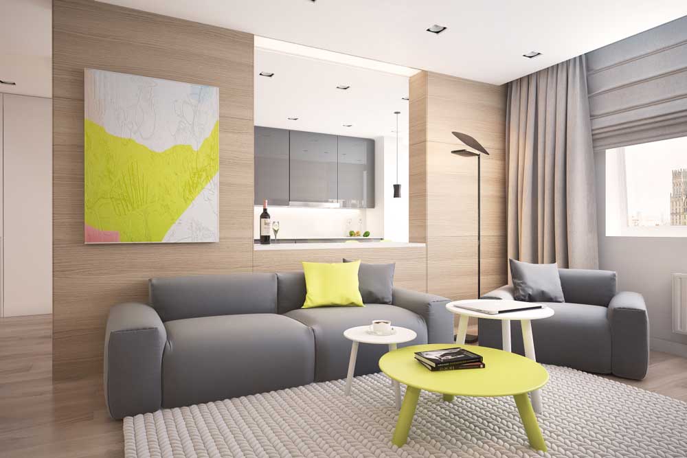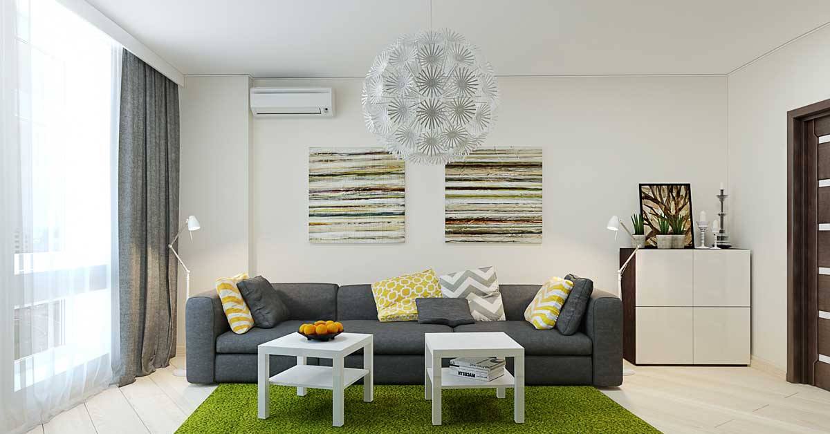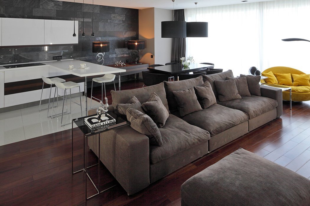 Dotado de la función de un acento de un solo color, un enorme sofá gris que llama la atención tan pronto como abre la puerta es oscuro y poco interesante.Coloréalo con almohadas, decora la habitación con cortinas o una alfombra con un estampado adecuado: el interior brillará con colores brillantes.