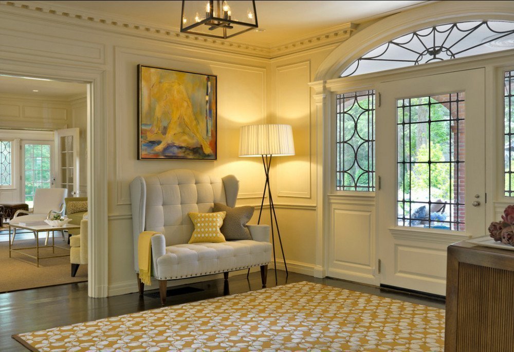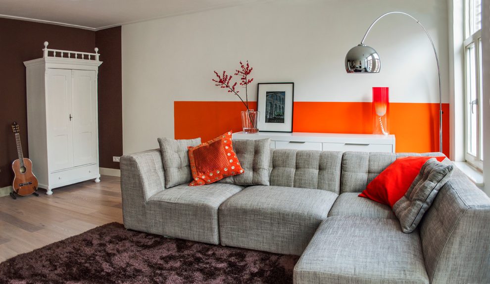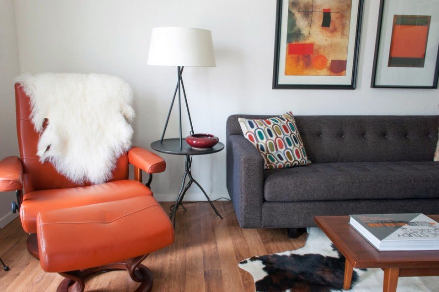 El diseño interior moderno ofrece combinaciones de colores llamativos de muebles tapizados: los sillones que combinan con el tono del sofá parecen anticuados. La monotonía característica de los estilos tradicionales está siendo reemplazada por el contraste. Los asientos suaves amarillos y naranjas se ven especialmente alegres al lado del sofá gris oscuro, el color "rojo anaranjado" es popular. Se seleccionan modelos de formas simples con reposabrazos que fluyen hacia la parte posterior.