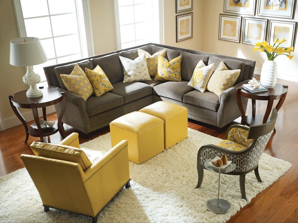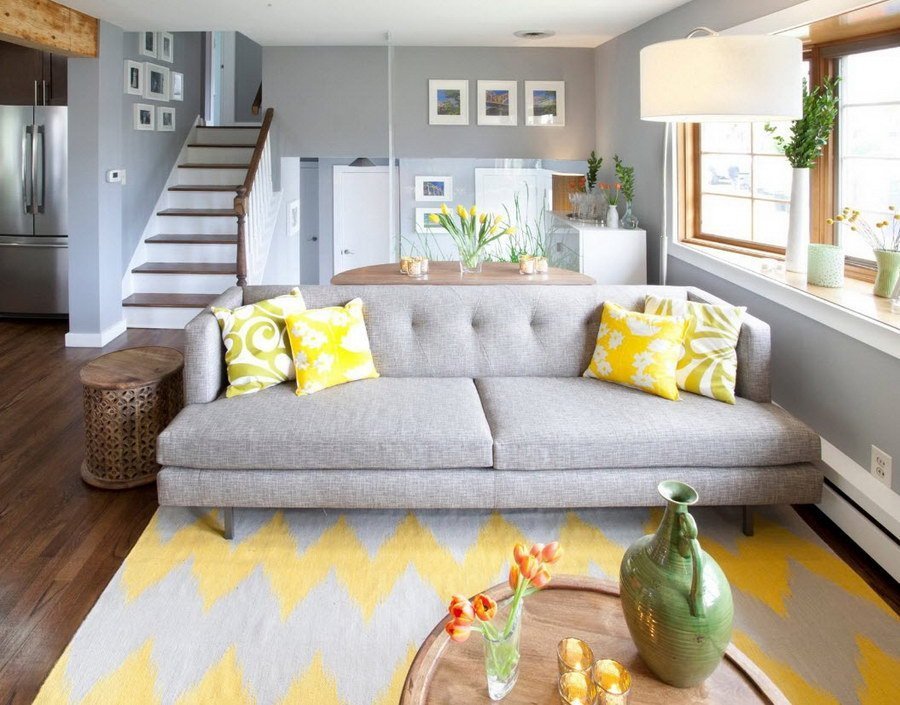 La gama de grises es extremadamente amplia: desde la sombra del lienzo sin blanquear hasta el color oscuro del asfalto mojado, casi negro. Sus variaciones intermedias, que se suman al color base de otros colores del espectro, ofrecen innumerables combinaciones para elegir.Es importante enfatizar la combinación correcta: mezclar gris con tonos cálidos a menudo da el efecto de un color "sucio". En este caso, es preferible usar los colores por separado: haga que el gris sea el fondo principal del sofá y use amarillo, rojo y mostaza para los elementos decorativos (almohadas, pufs laterales, reposabrazos falsos).