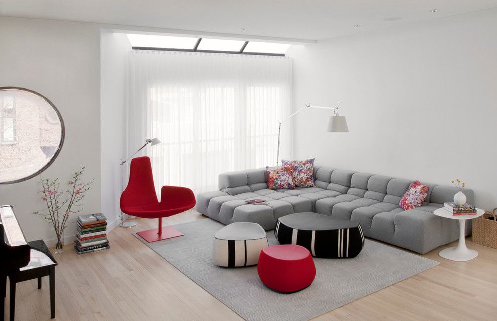 Otra opción para crear un espacio brillante y saturado de acción consiste en reemplazar la tapicería gris del sillón con una tela de color rojo rubí brillante. Esta técnica es adecuada para decorar la sala de estar, el estudio, los espacios activos.