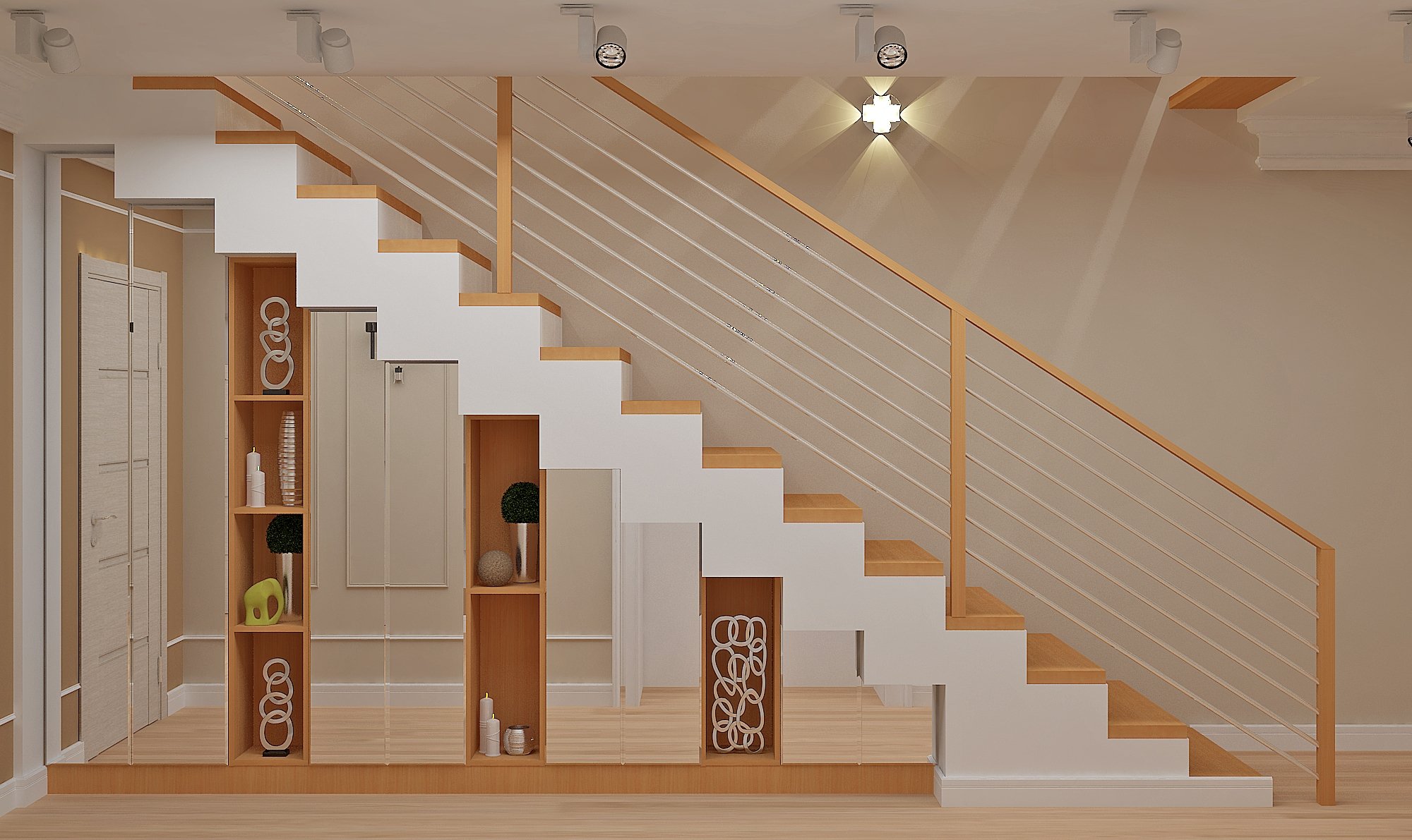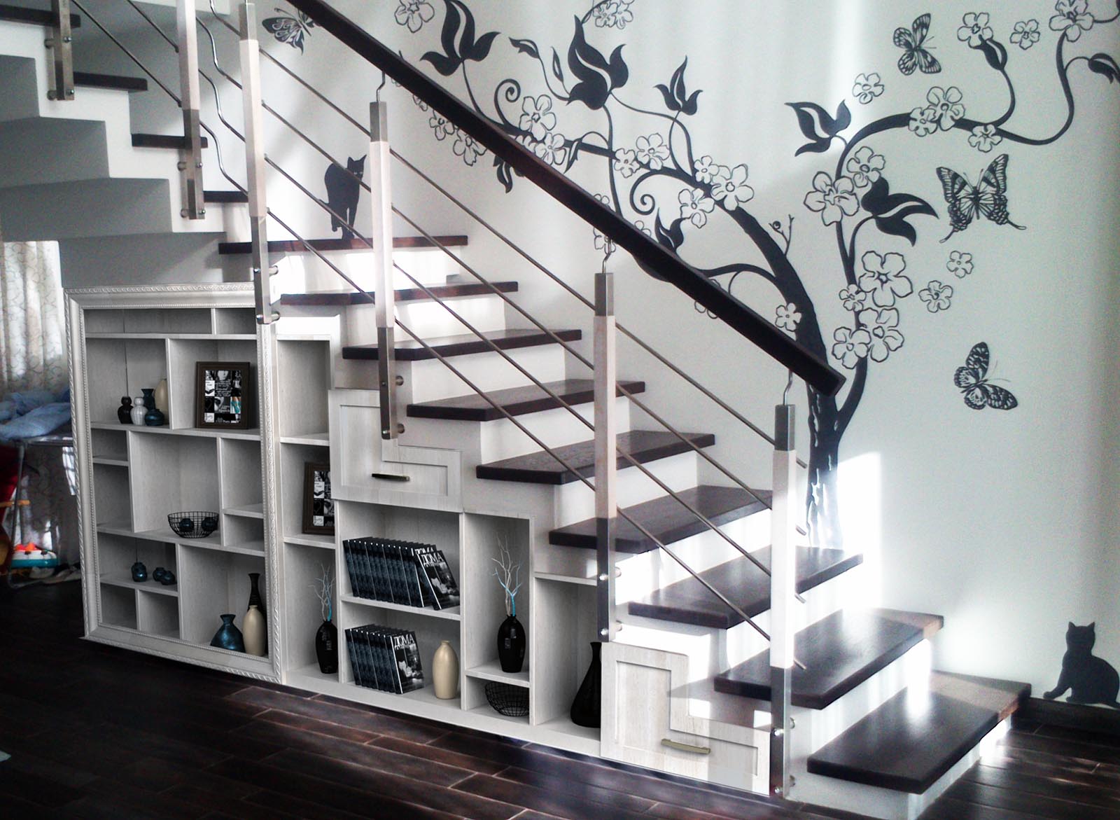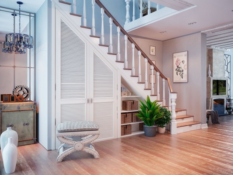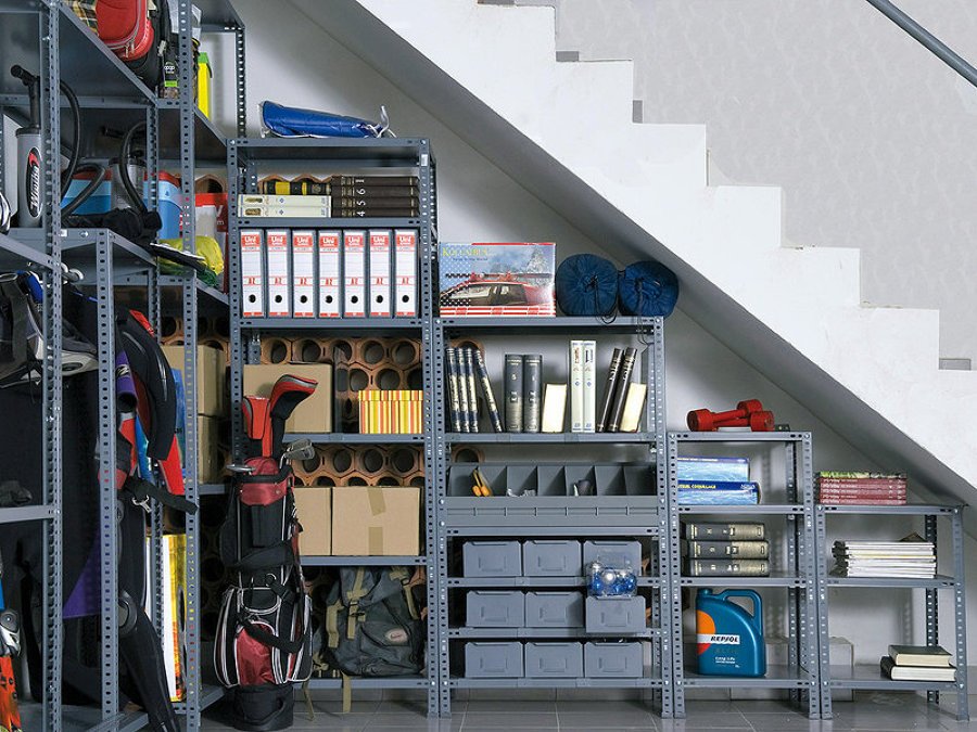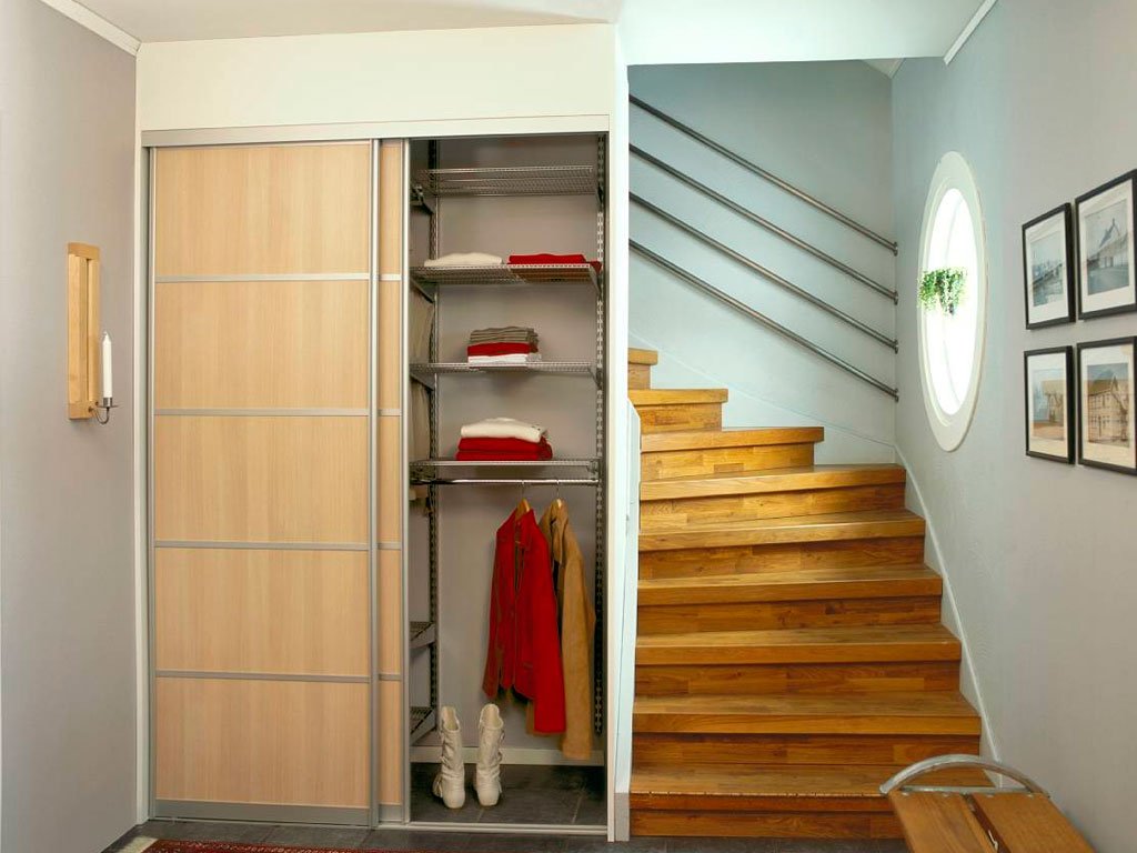 Organización del espacio. Una gran cantidad de estantes debajo de los escalones ayudará a restablecer el orden entre cosas, zapatos, utensilios de cocina (dependiendo del propósito funcional del gabinete). Esta solución tiene sus inconvenientes:
