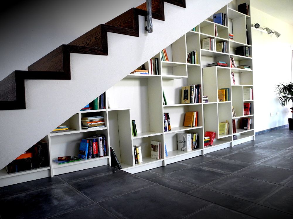 Estantería abierta. De hecho, hay armarios sin puertas para colocar platos, libros, revistas, decoración fina o, por ejemplo, colecciones de muñecas, si la escalera está al lado de la habitación de los niños.