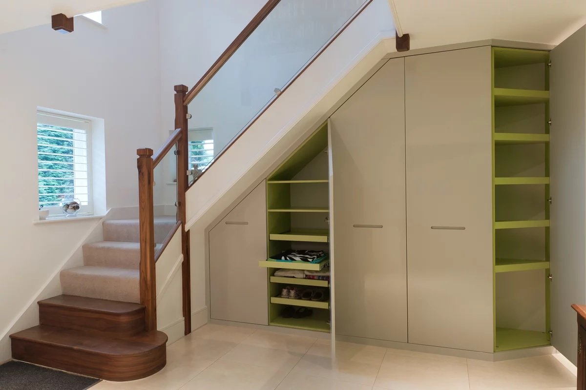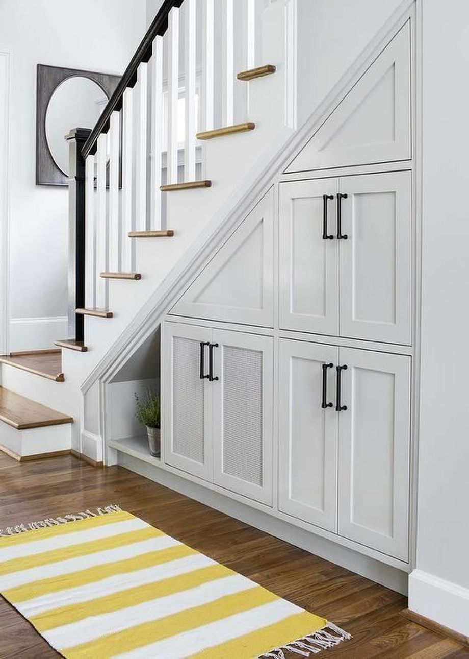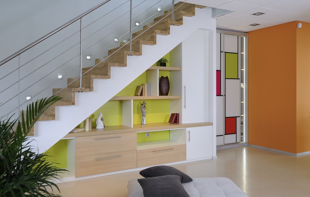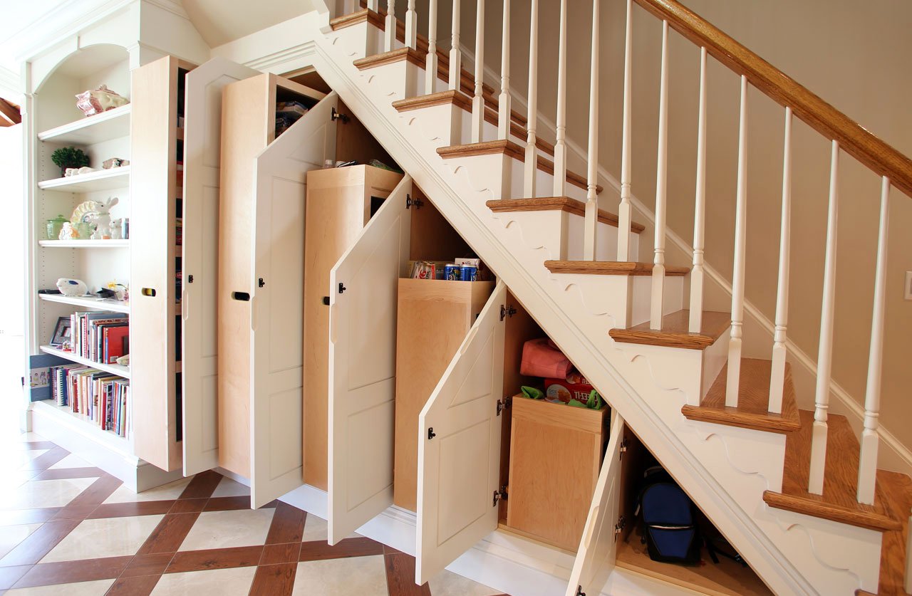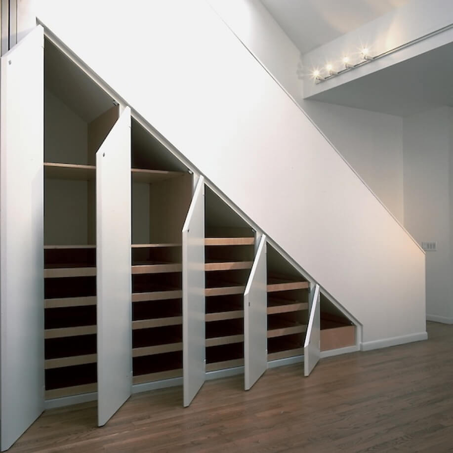 Debajo de la escalera, puede organizar una variedad de lugares de almacenamiento: