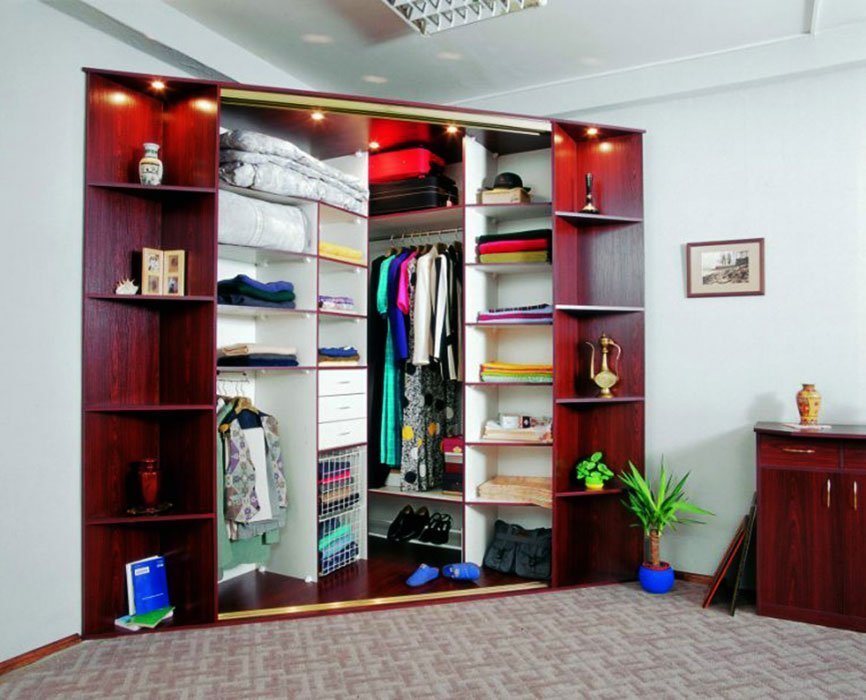 Debe elegir el diseño apropiado para el nuevo gabinete, centrándose en su ubicación de instalación en el apartamento. Hay modelos de casco que se pueden reorganizar en cualquier momento que desee. También hay modelos incorporados. Un gabinete independiente puede estar equipado con puertas o estar abierto. En este caso, el acceso a las oficinas será fácil y simple. Los modelos de cajas se desmontan y transportan rápidamente. Al mudarse, los propietarios podrán llevar el producto comprado con ellos.Pero es poco probable que los modelos incorporados sean adecuados para su uso posterior en viviendas nuevas.