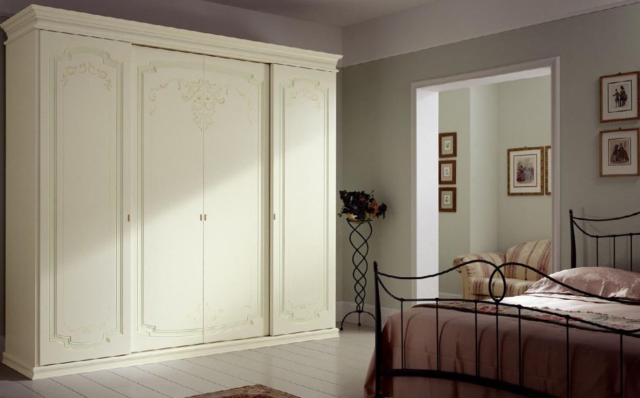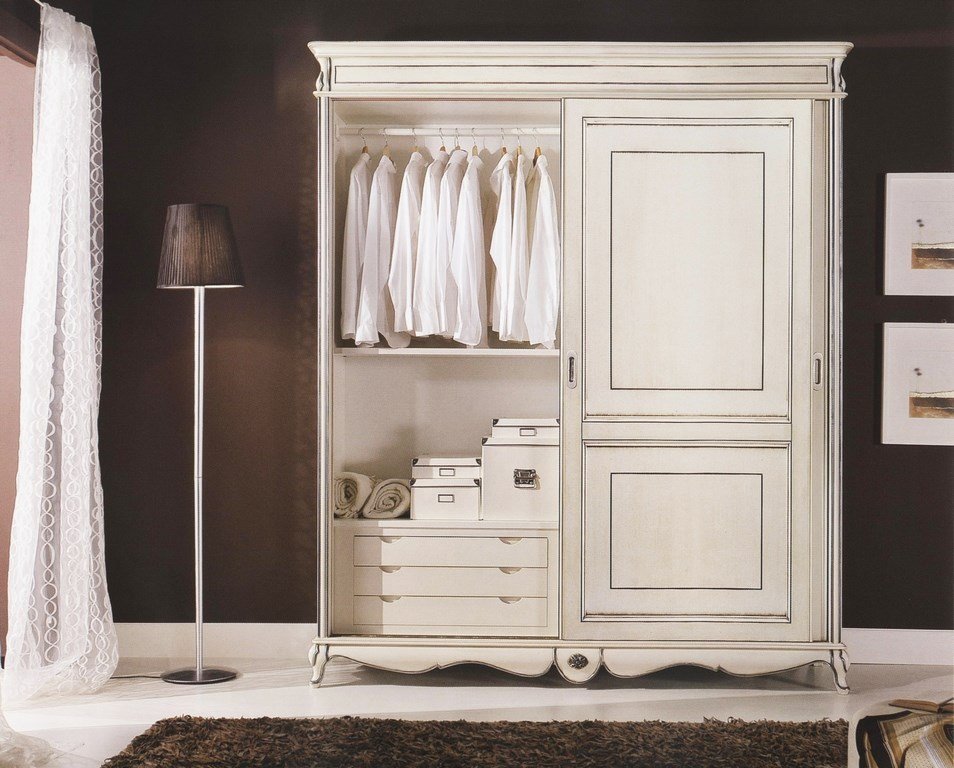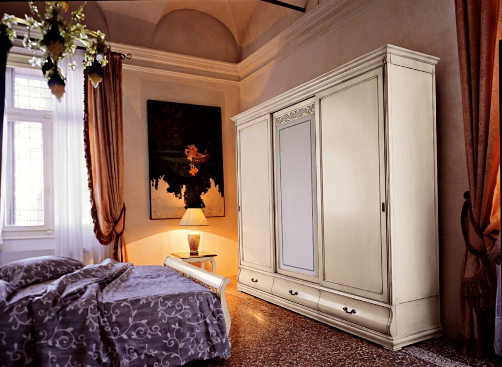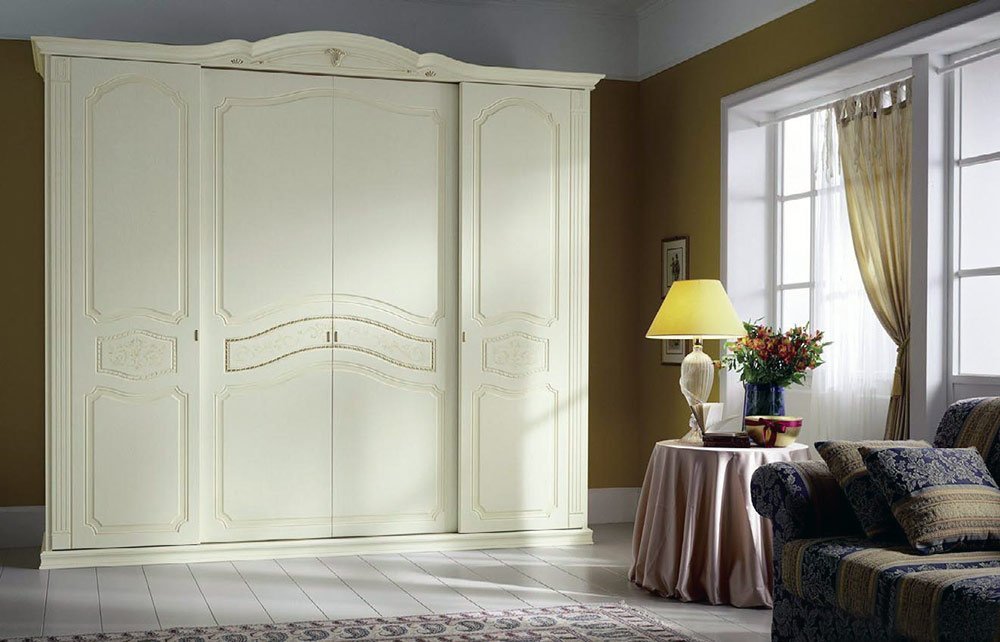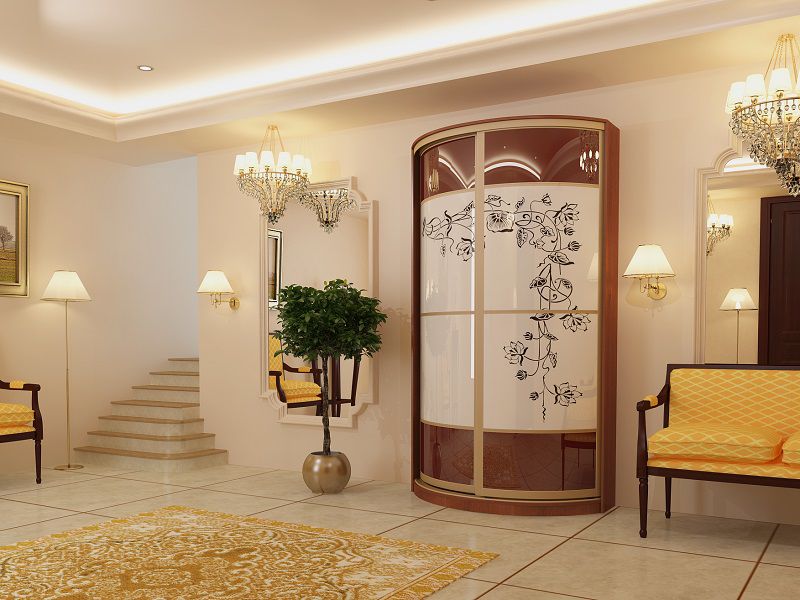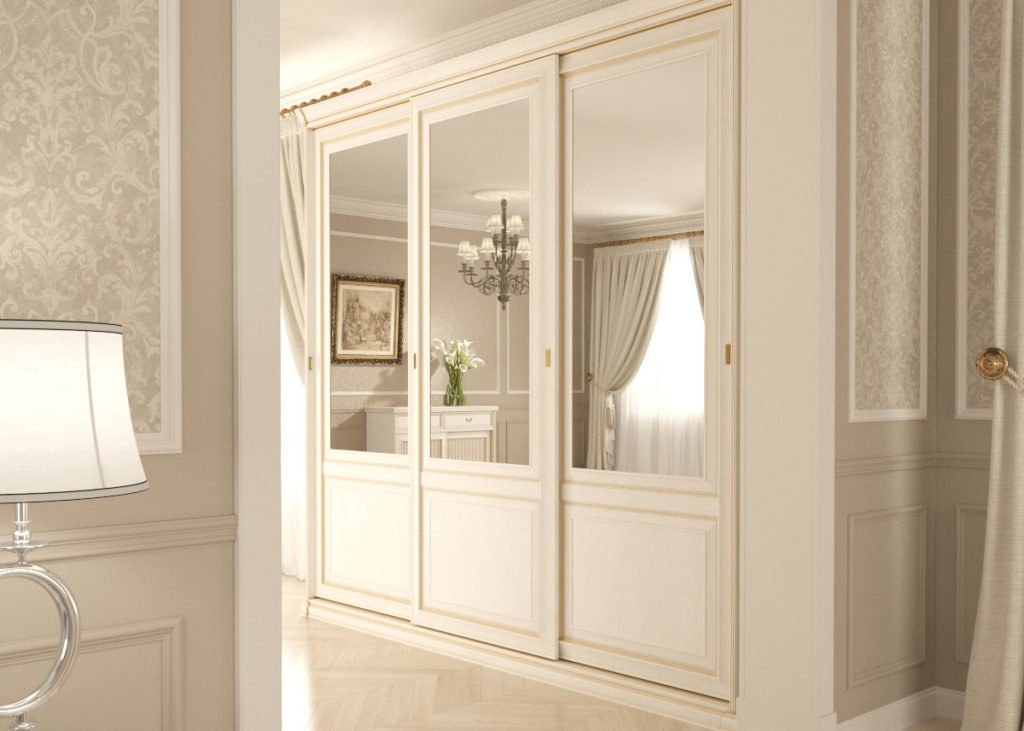 La versión clásica del diseño de modelos permite equipar cualquier habitación con calma y elegancia. Esta dirección se caracteriza por colores claros (crema, café). Deseable para los modelos es la presencia de una decoración sofisticada. Por ejemplo, las fachadas se pueden decorar con superposiciones en relieve de madera de varios niveles. Aceptable para tal estilo e inserciones de espejo, fachadas "en blanco". A menudo, los modelos se hacen con estilización de las puertas exteriores (si hay más de 2) debajo de las columnas. Muchos de ellos se complementan con patrones ornamentales de oro o plata. Se permiten estantes laterales para artículos pequeños o un par de compartimentos "abiertos". La principal ventaja de este diseño es la versatilidad. El gabinete "clásico" puede complementar prácticamente las habitaciones, que no tienen un estilo específico de diseño.