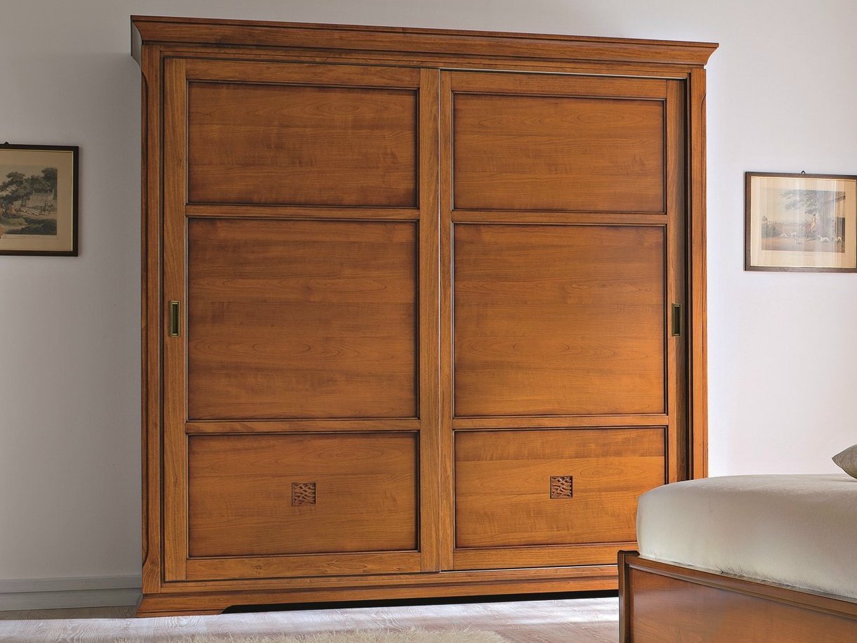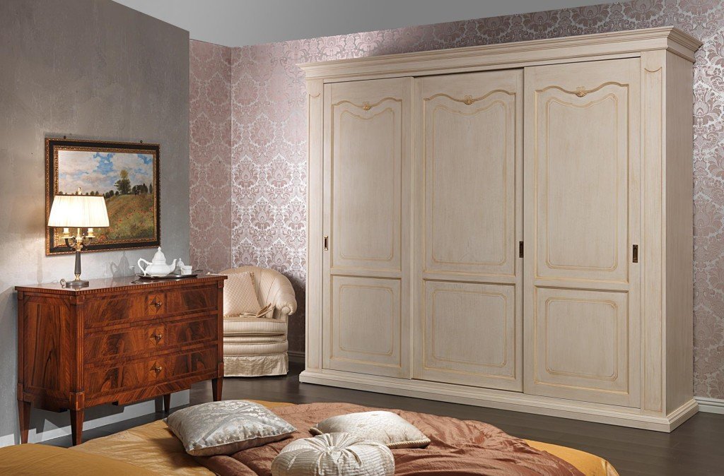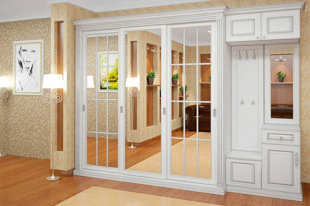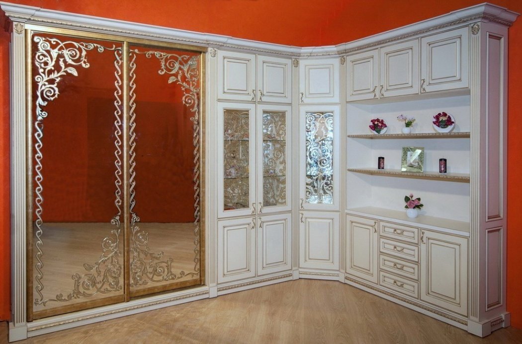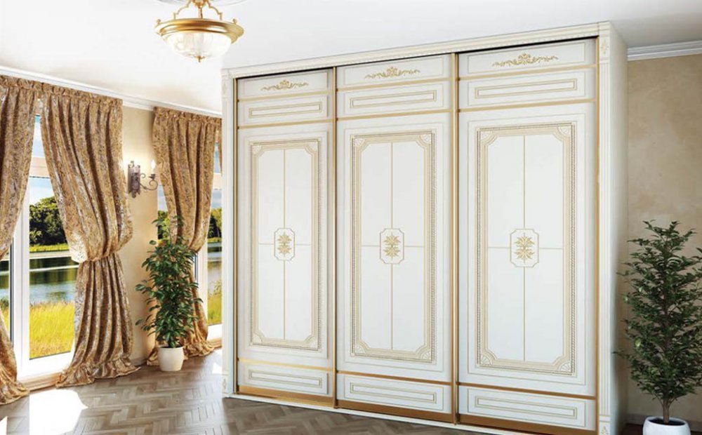 La versión clásica del diseño de modelos permite equipar cualquier habitación con calma y elegancia. Esta dirección se caracteriza por colores claros (crema, café). Deseable para los modelos es la presencia de una decoración sofisticada. Por ejemplo, las fachadas se pueden decorar con superposiciones en relieve de madera de varios niveles. Aceptable para tal estilo e inserciones de espejo, fachadas "en blanco". A menudo, los modelos se hacen con estilización de las puertas exteriores (si hay más de 2) debajo de las columnas. Muchos de ellos se complementan con patrones ornamentales de oro o plata. Se permiten estantes laterales para artículos pequeños o un par de compartimentos "abiertos". La principal ventaja de este diseño es la versatilidad. El gabinete "clásico" puede complementar prácticamente las habitaciones, que no tienen un estilo específico de diseño.