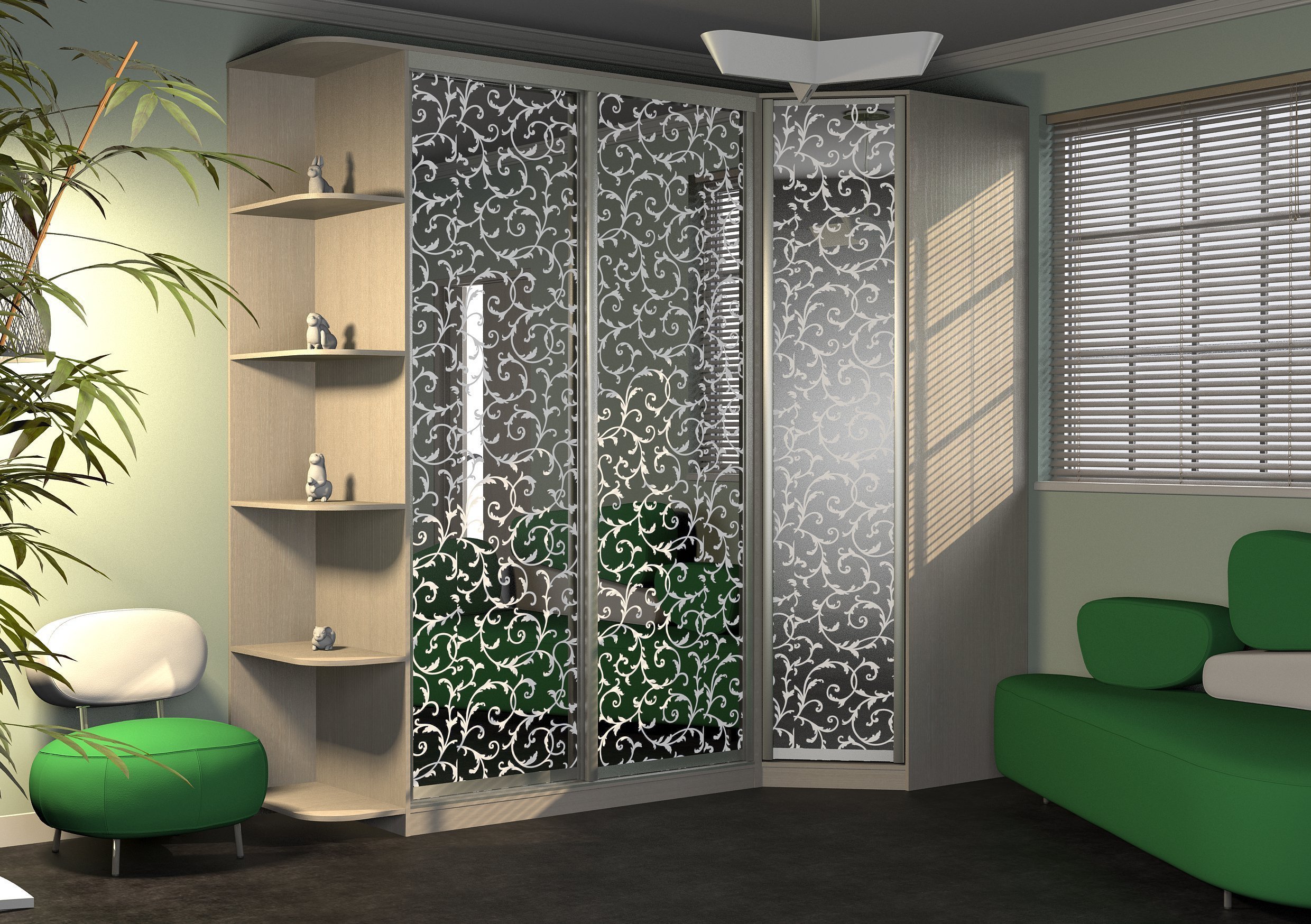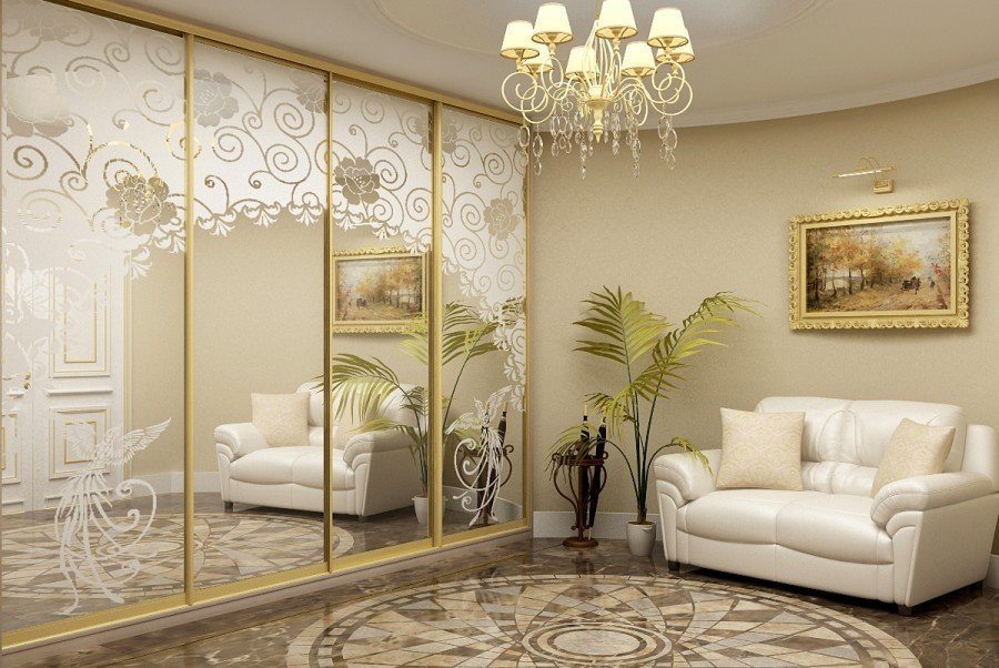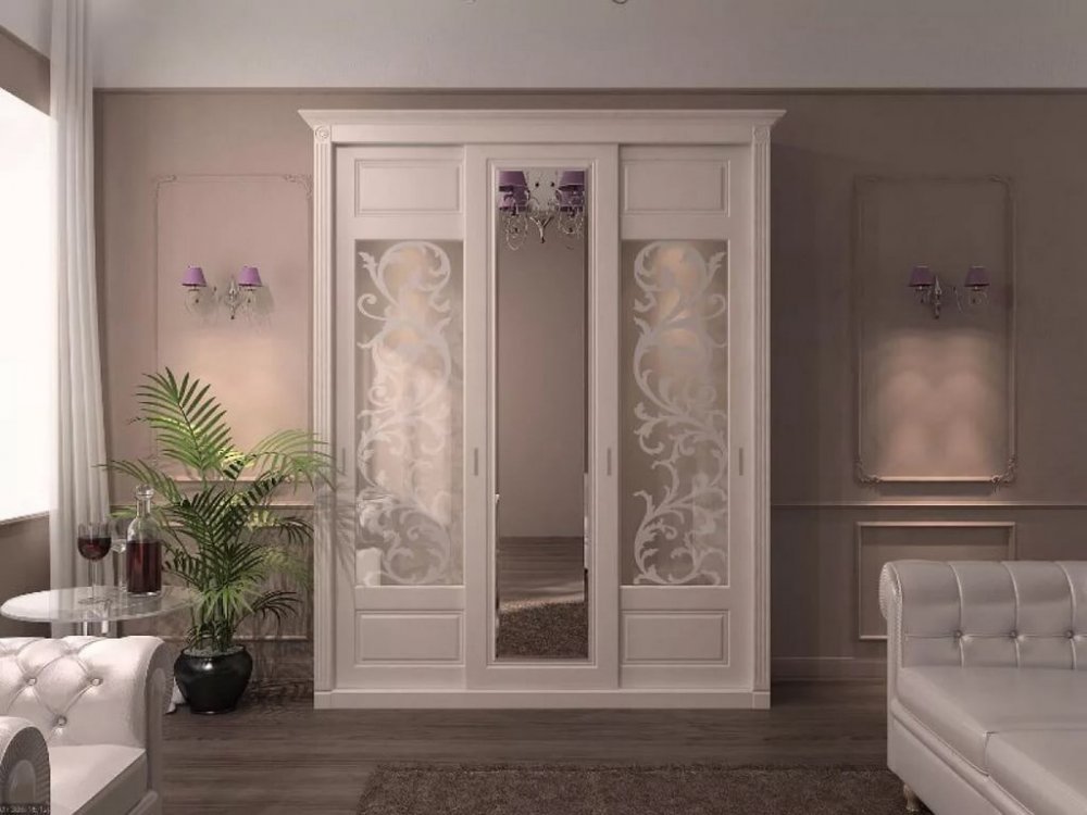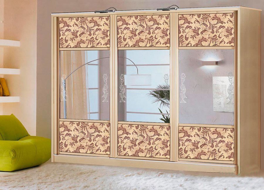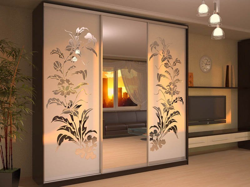 Es una opción práctica y económica. Atrae la elección de modelos originales con un espejo, que están decorados con patrones o imágenes. La facilidad de mantenimiento de las imágenes de chorro de arena le permite instalar productos en cualquier lugar. Las amas de casa pueden usar un simple limpiacristales para eliminar el polvo y la suciedad. Las imágenes de chorro de arena pueden tener contornos claros o verse como imágenes borrosas. Los más populares en este diseño se consideran modelos con patrones frondosos y florales, imágenes de plantas y árboles. A menudo, los clientes eligen modelos con dibujos en forma de abstracciones, adornos. En la fabricación de gabinetes personalizados, se les pueden aplicar varias imágenes: siluetas de animales, personas, tipos de ciudades, paisajes.