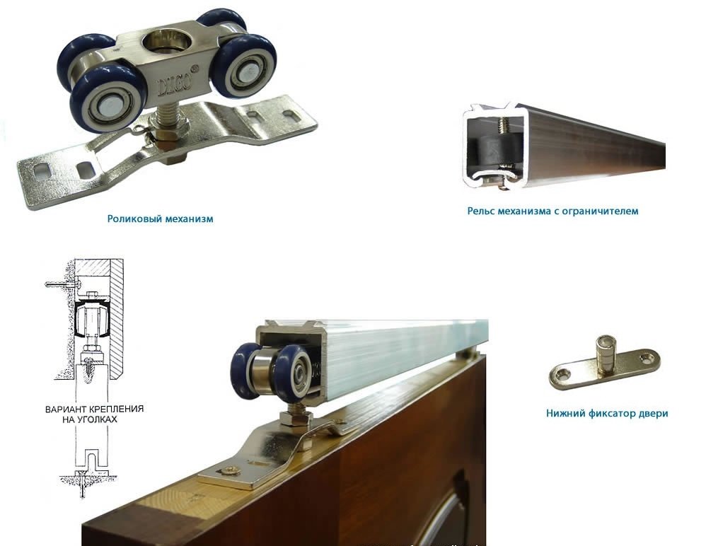 Los sistemas de suspensión para puertas correderas son de acero o aluminio. Se seleccionan de acuerdo con los materiales del marco. Para elementos de vidrio debido a su gran peso, se utilizan accesorios de acero o aluminio con mayor resistencia. Para gabinetes estándar, se utilizan mecanismos de aluminio. La suspensión del sistema en la parte superior del producto crea una carga mínima en la parte inferior de la estructura, simplifica el movimiento de las alas. Los perfiles de acero y aluminio están pintados en cualquier color con compuestos especiales. Aumentan la protección del metal, le dan un aspecto atractivo.