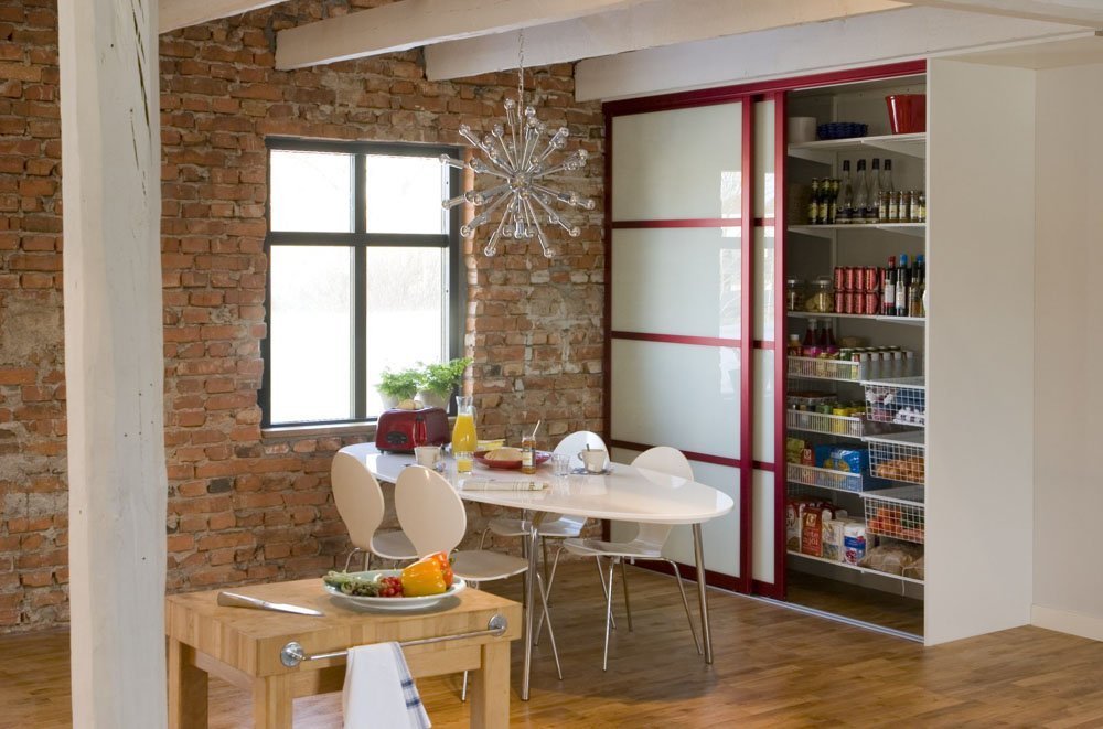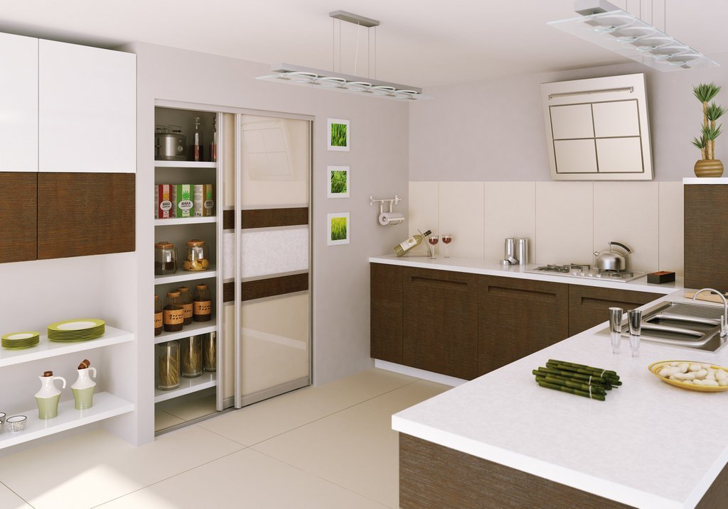 Típicamente, las cocinas tienen gabinetes pequeños. Pero la elección de un modelo con puertas correderas ayudará a reemplazar los auriculares habituales. Para la cocina, los modelos con fajas de vidrio son adecuados. Se limpian fácilmente de grasa y polvo. Y no habrá problemas para mantener la limpieza. En su interior puede colocar numerosos estantes. Son adecuados para el almacenamiento de especias, conservación, envases con cereales. También puede colocar cajones en el gabinete. Ayudarán a almacenar de forma compacta los utensilios de cocina, que rara vez se usan: batidores, corchos, tapas de costura y llaves de costura. En la parte superior, puede seleccionar varios estantes para almacenar servicios.