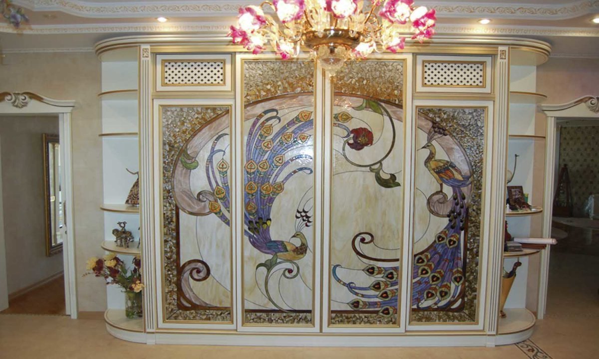 La opción de diseño más interesante es el vitral. Se puede realizar como dibujos reales o para representar fondos no estándar, abstracciones. La aplicación de imágenes con composiciones especiales de alta calidad. Es por eso que se descarta su violación durante la limpieza u operación de los productos. Se pueden hacer dibujos coloridos en cualquier estilo. Muy a menudo presentan panoramas completos, representando algunas pinturas clásicas. También pueden representar animales geniales, personajes estilizados, personas, automóviles. Esta opción es muy interesante en una determinada versión de color: cuando se usan solo 2-3 colores. Las imágenes vívidas con numerosas transiciones de color se ven más modernas y elegantes. Los modelos originales se pueden instalar en cualquier habitación de la casa.