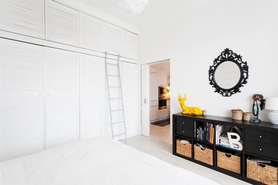 El gabinete blanco es ideal para el estilo escandinavo. La fachada puede ser sólida o consistir en elementos individuales, complementados con inserciones. Los mejores materiales para las fachadas de los modelos escandinavos se consideran barniz, lacobel, madera pintada, piel clara. Se ve atractivo con pequeñas intercalaciones de marrón claro, café o gris. Al elegir modelos escandinavos, debe centrarse en un diseño simplificado. Vale la pena considerar la correspondencia del producto seleccionado con el tipo general de habitación, cómoda o mesa, que se ubicará cerca. Otro secreto para elegir un modelo exitoso: la selección de productos con molduras negras delgadas en las partes superior y media.