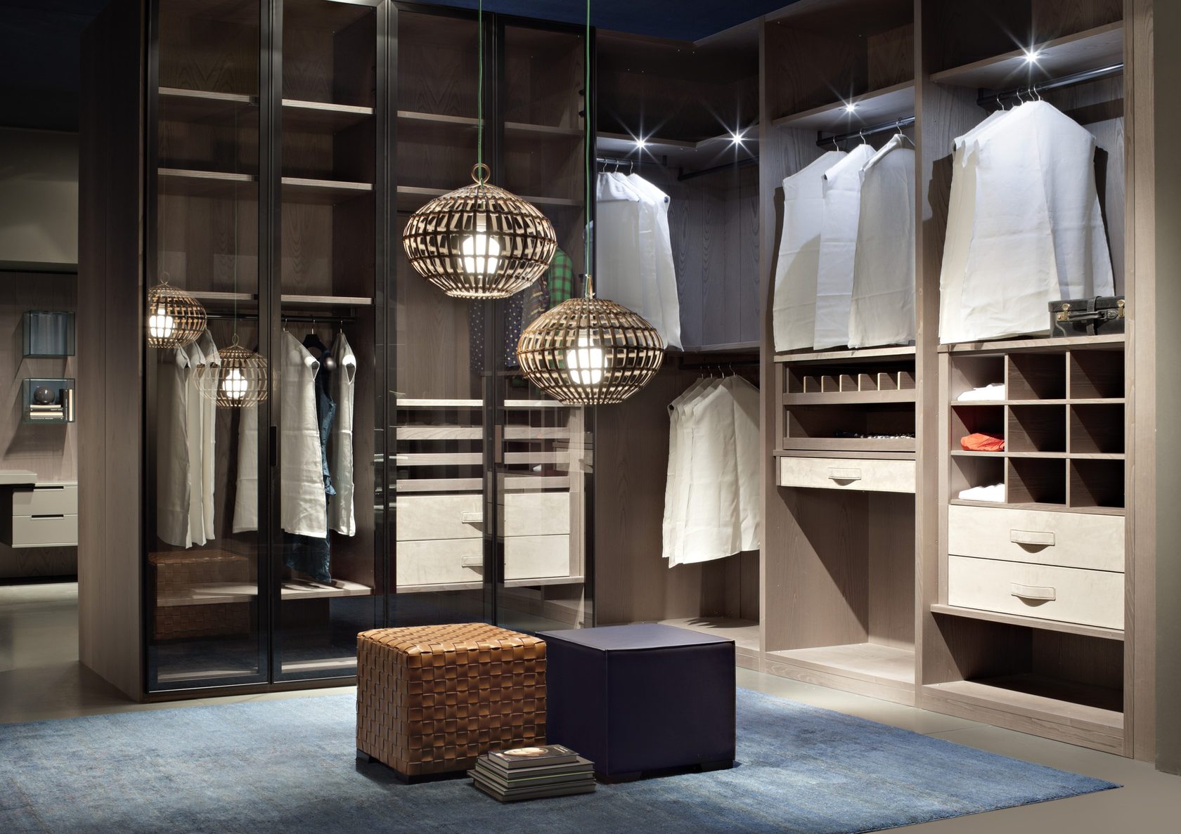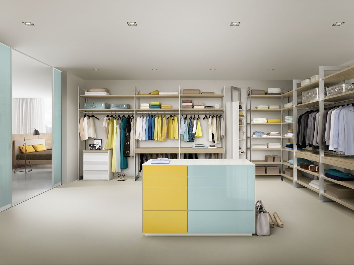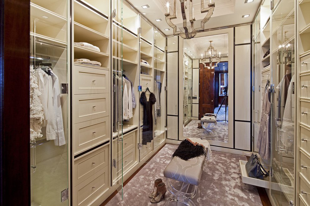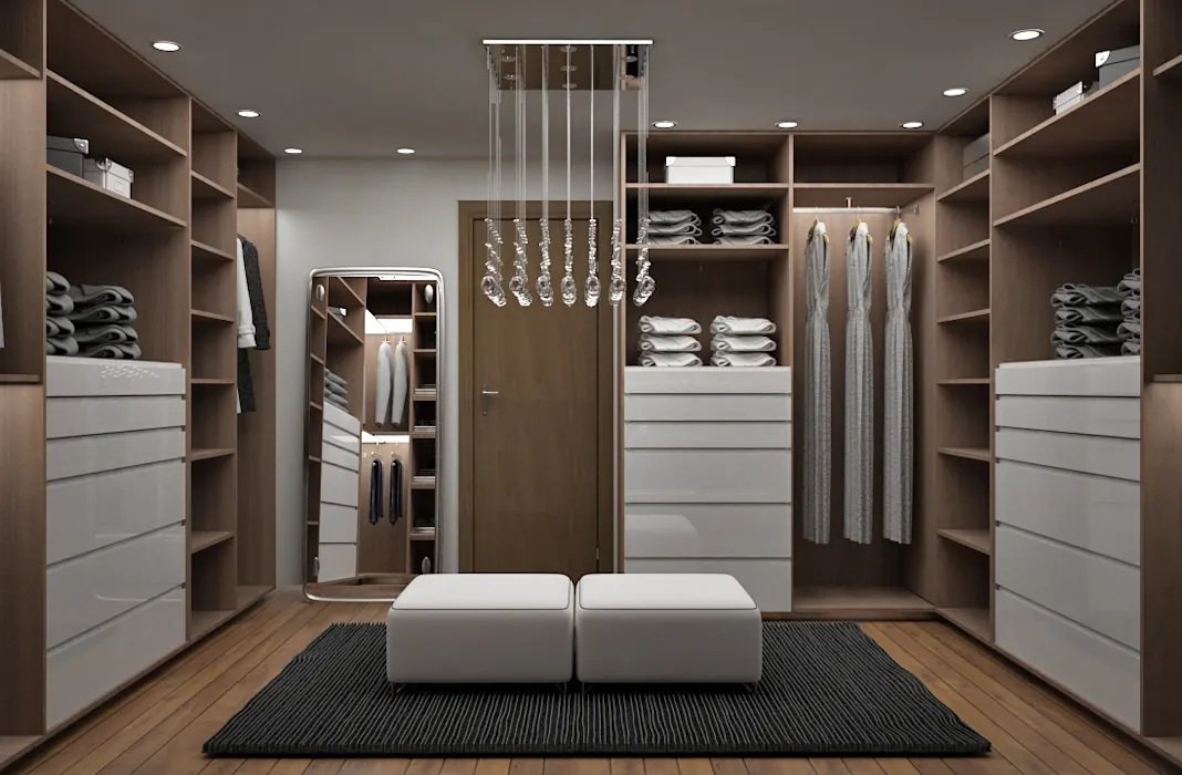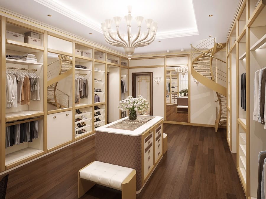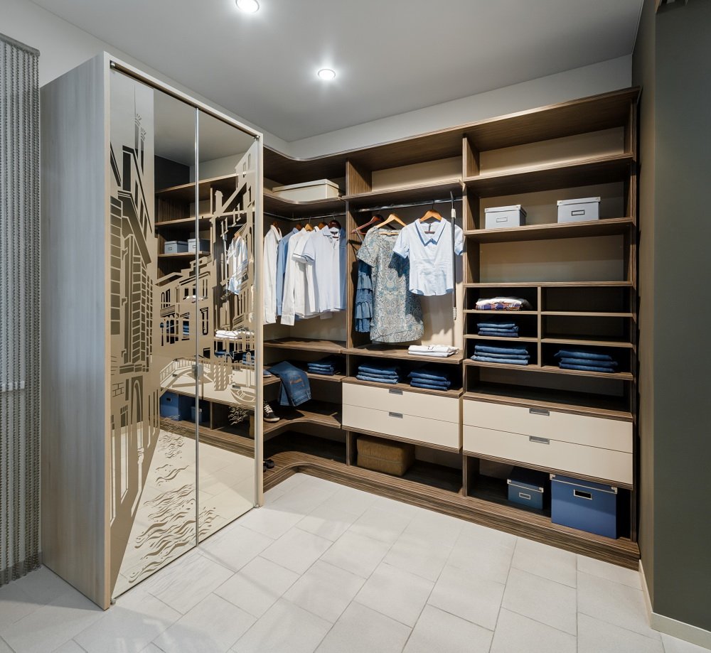 Hay muchas versiones de vidrio para espejos de productos para el vestidor, complementadas con automatización y control de acceso. Las prácticas particiones de vidrio decoran efectivamente el interior. Estos pueden ser productos estándar o creados de acuerdo con parámetros individuales.