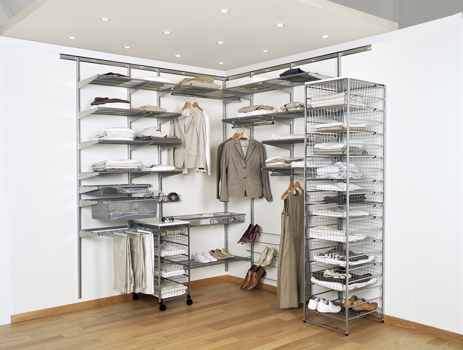 El aluminio para la disposición del vestidor costará más que las contrapartes de acero. La fácil instalación y la facilidad de operación permiten que los detalles de diseño de ajuste de la más alta calidad sean mutuamente compatibles. Las propiedades físicas del aluminio le permiten dejar todas las partes de hierro en su forma natural. El material no teme a la corrosión y no requiere manchas, a menudo se usa para la fabricación de mecanismos de trabajo. La variedad de tales sistemas es escasa, no difiere en variedad, las piezas se rompen y deforman fácilmente.