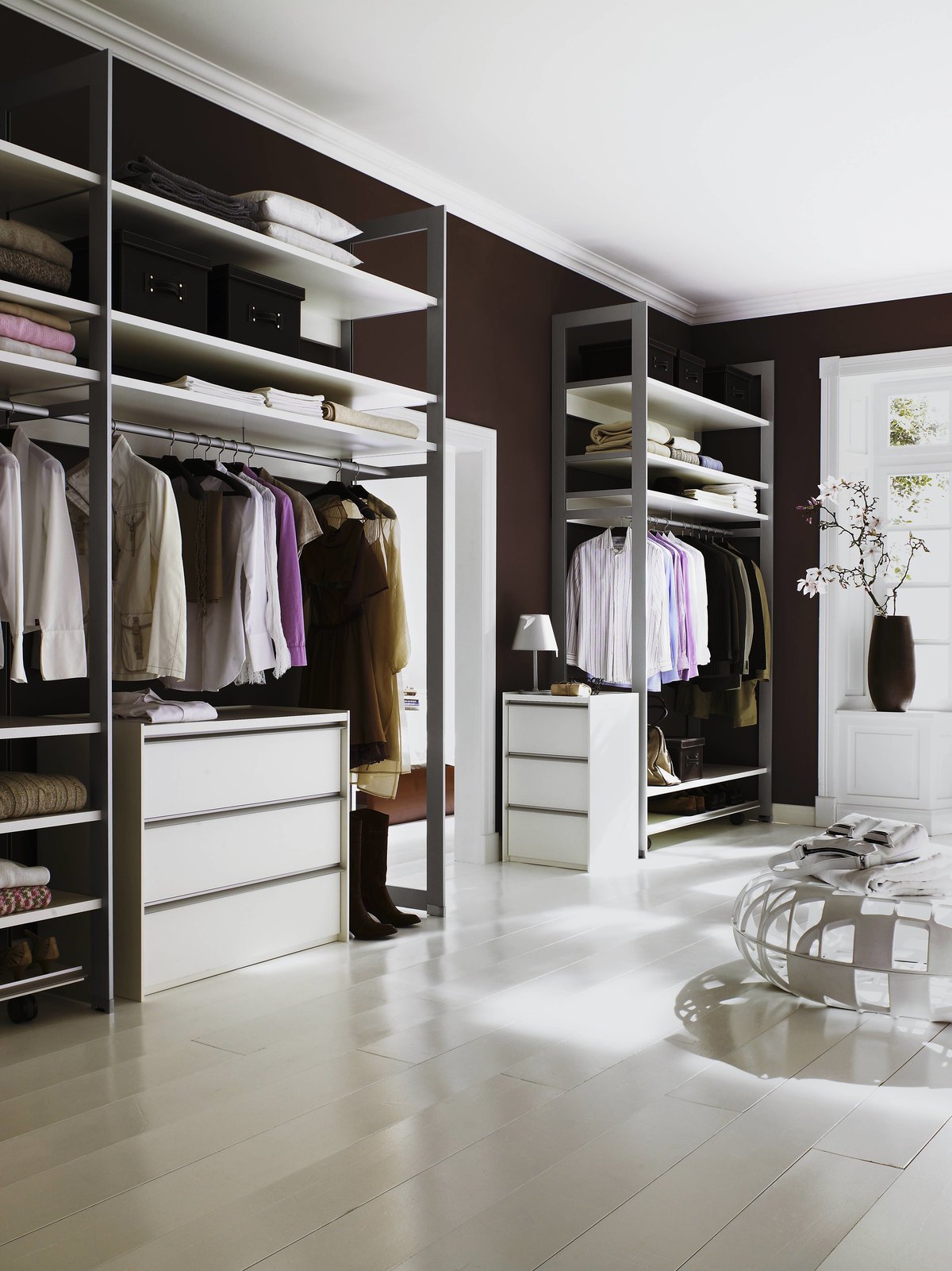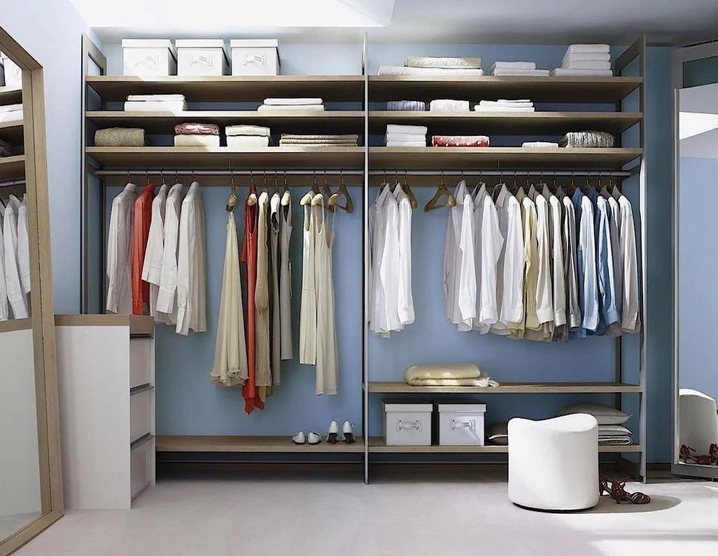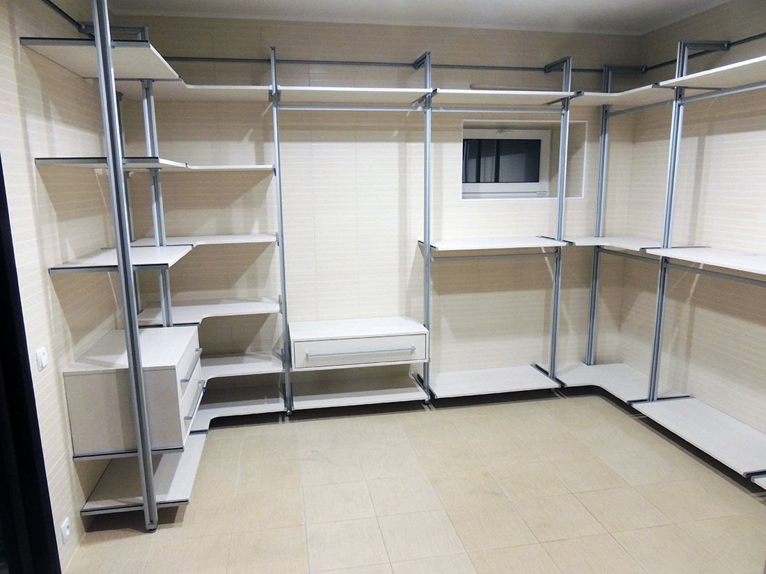 El marco de acero puede ser de un solo nivel o de dos niveles.Los sistemas de columnas son convenientes para organizar la zonificación del camerino, con su ayuda puede dividir con éxito el espacio. Contras: sin restricciones en los estantes. El tipo abierto de estantes no protegerá la caída de la ropa apilada en una pila.