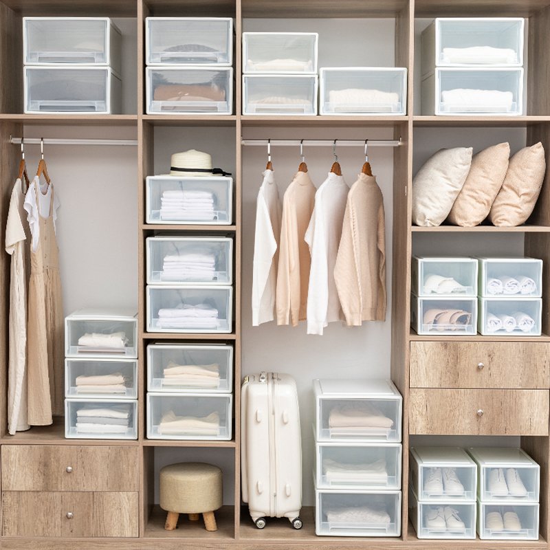 Los elementos de almacenamiento portátiles cerrados pueden ser de diferentes diseños, colores y tamaños. Están hechos de madera contrachapada, cartón, plástico. Los productos pueden coincidir exactamente con los colores del vestidor o tener un buen tono de acento.