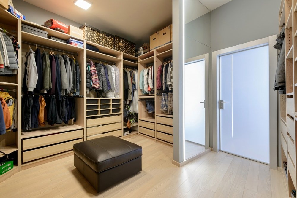 Las variedades de materiales resistentes a la humedad son adecuadas para vestuarios junto a habitaciones con alta humedad, por ejemplo, cerca de un baño o cocina. Todos los paneles de madera son resistentes al daño mecánico, ecológicos y asequibles.