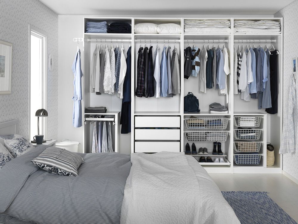 Los armarios universales de IKEA se adaptan perfectamente a los locales de cualquier tamaño. Para ellos, un espacio en la esquina o a lo largo de la pared es adecuado. El diseño simple le permite utilizar como complemento todo tipo de rieles, varillas, cestas y cajas.