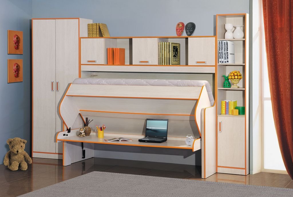 En habitaciones estrechas, la optimización del espacio es lo primero. Una mesa que se convierte en cama tiene desventajas: debe recordarse que acostarse durante el día no funcionará. Para un día de descanso, necesita un lugar libre. El diseño final tendrá el aspecto de una mesa, pero además hay un lugar para mesitas de noche, armarios y estanterías. El sofá de mesa está hecho con una cama, una caja y un mecanismo de elevación. El producto se ensambla con una caja incorporada o separada, según el diseño. La estructura generalmente se monta en la pared. El mejor material para muebles serán aglomerados de madera. Las cajas se ensamblan a partir de barras con una sección transversal de 5 × 5 cm, los soportes externos tienen una altura de 14-15 cm. Los elementos decorativos laterales se forman a partir de una tabla de pulgadas con una capa de madera de 1,5 cm. La confiabilidad del diseño dará una pendiente entre los extremos de las patas. Las bases extraíbles están hechas con barras o lazos de piano.