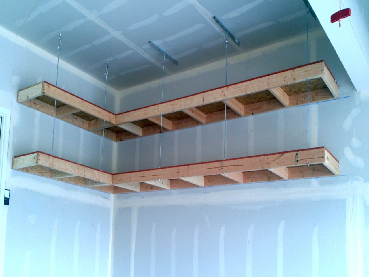 Estantes de techo: una especie de colgar. Para hacer un sistema de estantes en el techo, deberá determinar el lugar y la opción de colocación. Necesita un dibujo, puede dibujarlo a mano, lo principal es indicar correctamente todos los tamaños. Según el boceto, se aserran elementos individuales. La estructura final está hecha de una base de madera y una esquina de metal; Las paredes laterales pueden ser un perfil metálico redondo o un cable especial. La fijación se proporciona con tacos, anclajes. Los estantes están colgados en ganchos especiales que sobresalen de las vigas del techo. Si es necesario, los estantes se desmontan rápidamente. El diseño debe manejarse con cuidado; es posible que se balancee de los toques. No guarde cosas frágiles y herramientas costosas allí. En algunos casos, vale la pena considerar el uso de soportes para el montaje más confiable.