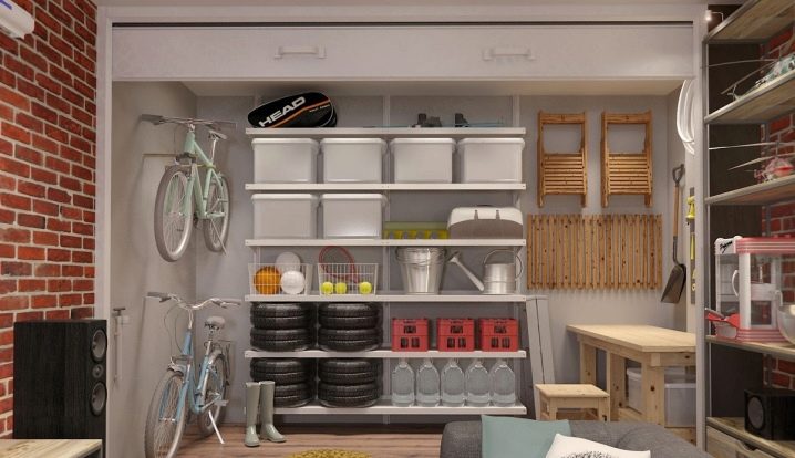 La opción estándar proporciona un valor promedio de estos parámetros. La altura suele ser igual a 180 cm (desde el piso hasta el estante superior), el ancho de la estructura estará al nivel de 1500-1600 mm. De importancia fundamental es la altura de los estantes. El valor ideal no es inferior a 35 cm, sin embargo, a menudo se encuentran variantes de una altura de 30 centímetros. El primer estante está ubicado de manera diferente: 60 centímetros del piso; La colocación inferior es incómoda. El ancho ideal (profundidad) de los estantes es de 40-50 cm.Otro método de selección de dimensiones proporciona consistencia con la altura de la habitación; Es mejor utilizar todo el espacio por debajo de 50 cm del techo. Los estantes colgantes pueden coincidir con la longitud total de la pared con 10 cm de margen de montaje. La profundidad ideal de estos estantes es de 50-60 cm. Sin embargo, se recomienda buscar otro lugar para almacenar cajas, repuestos, ruedas y neumáticos de automóviles o usar estantes colgantes con una altura y ancho ajustables de 80 cm.