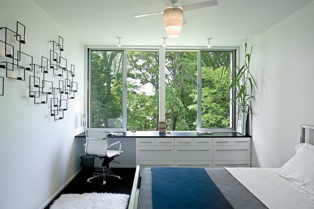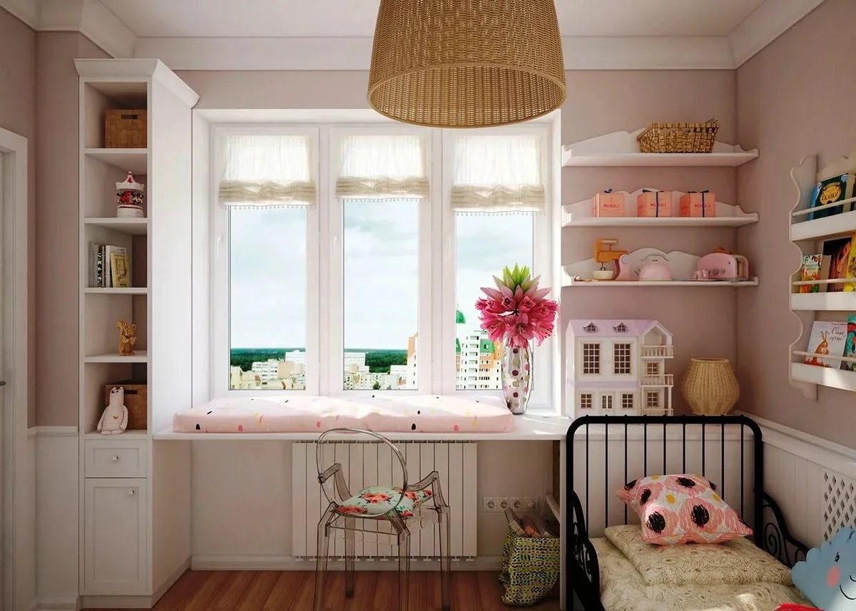En el dormitorio, la mesa del alféizar de la ventana se puede usar para diferentes propósitos: