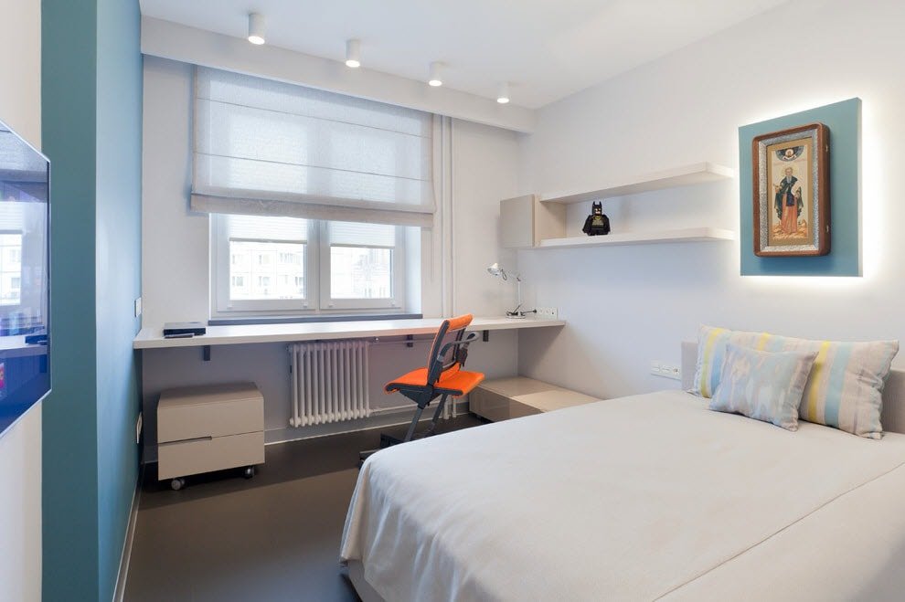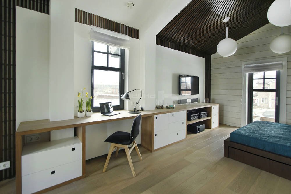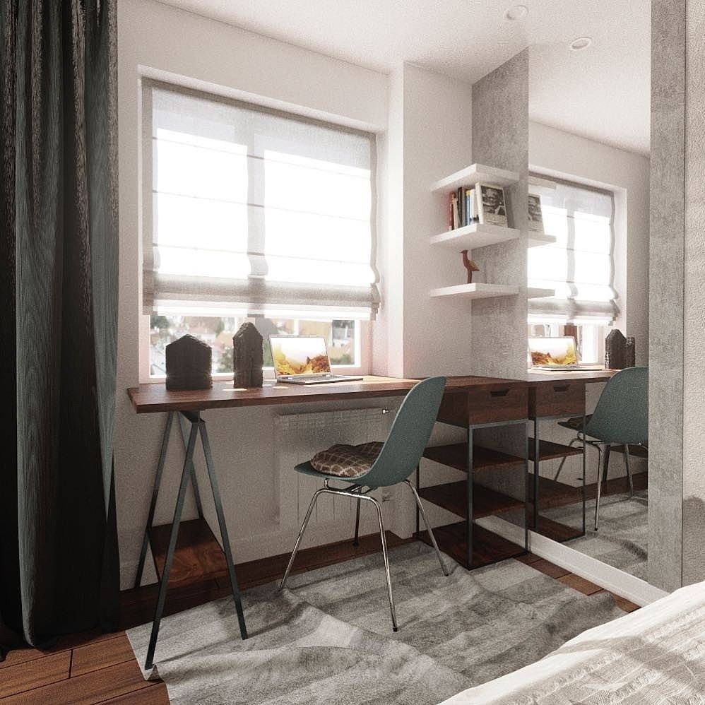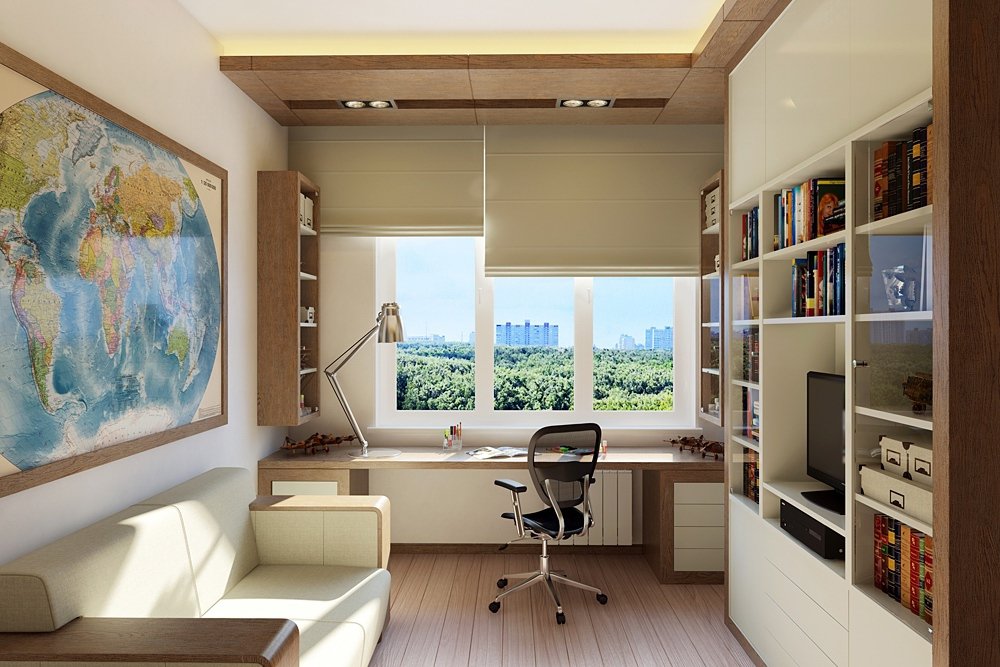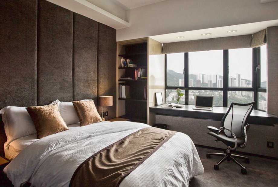 Como lugar de trabajo. Si una pareja vive en la habitación, tendrá que comprar una pantalla móvil o instalar una barra de cortina con cortinas para que la vigilia nocturna de una persona no interfiera con otra que está tratando de dormir. Después de complementar el escritorio con estanterías, el diseñador creará una atmósfera especial "cálida" en la habitación, que es especialmente importante para el dormitorio, donde una persona se acomoda para descansar.