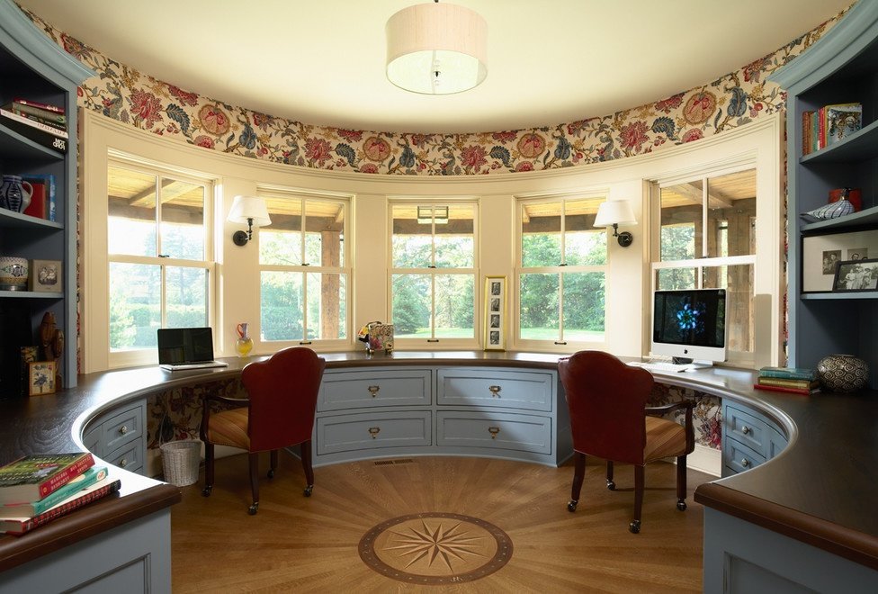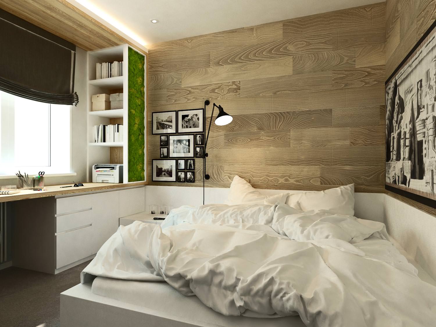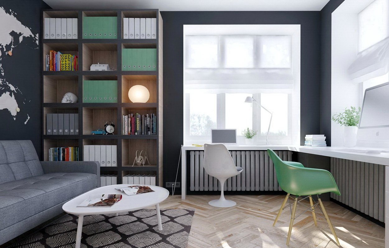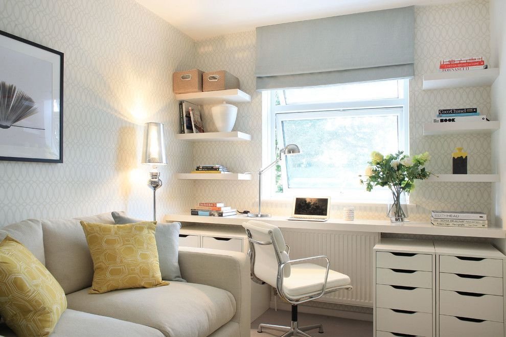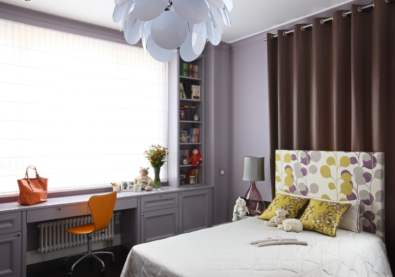 Como lugar de trabajo. Si una pareja vive en la habitación, tendrá que comprar una pantalla móvil o instalar una barra de cortina con cortinas para que la vigilia nocturna de una persona no interfiera con otra que está tratando de dormir. Después de complementar el escritorio con estanterías, el diseñador creará una atmósfera especial "cálida" en la habitación, que es especialmente importante para el dormitorio, donde una persona se acomoda para descansar.